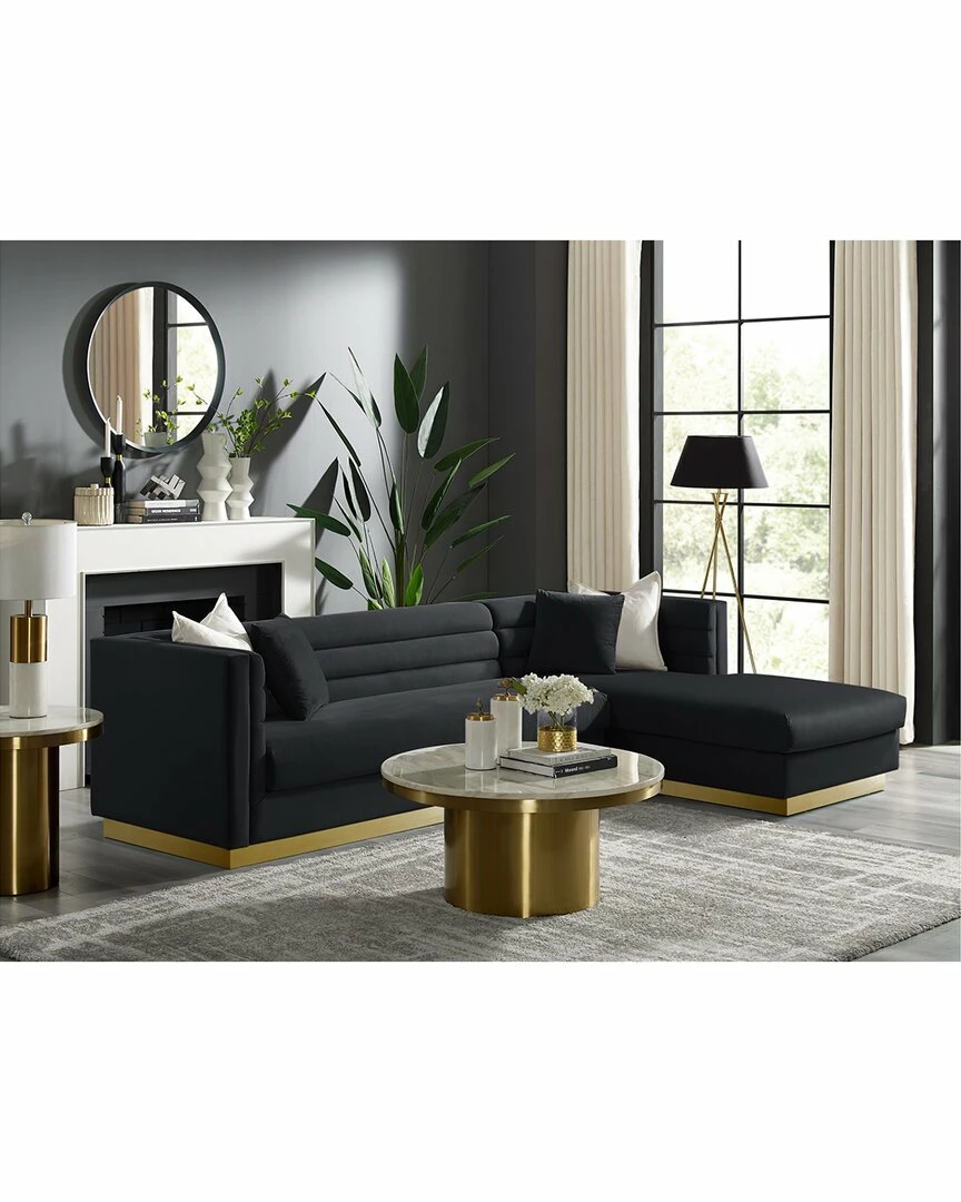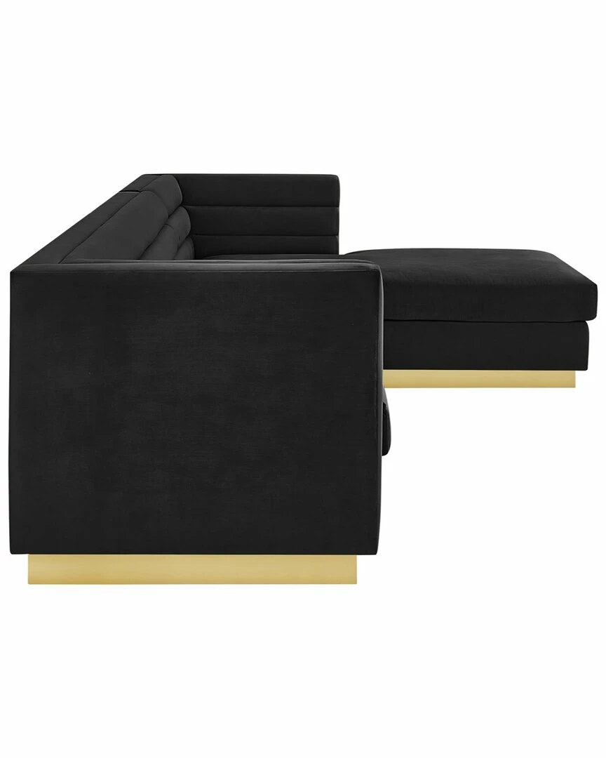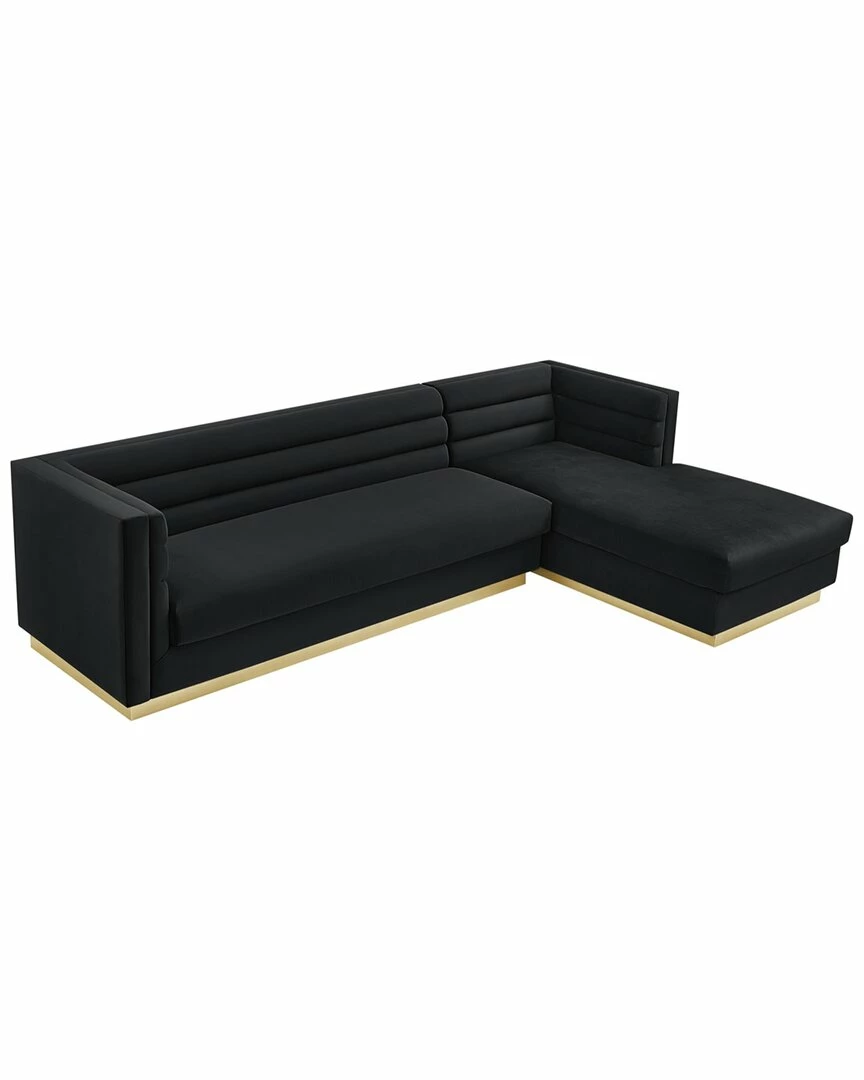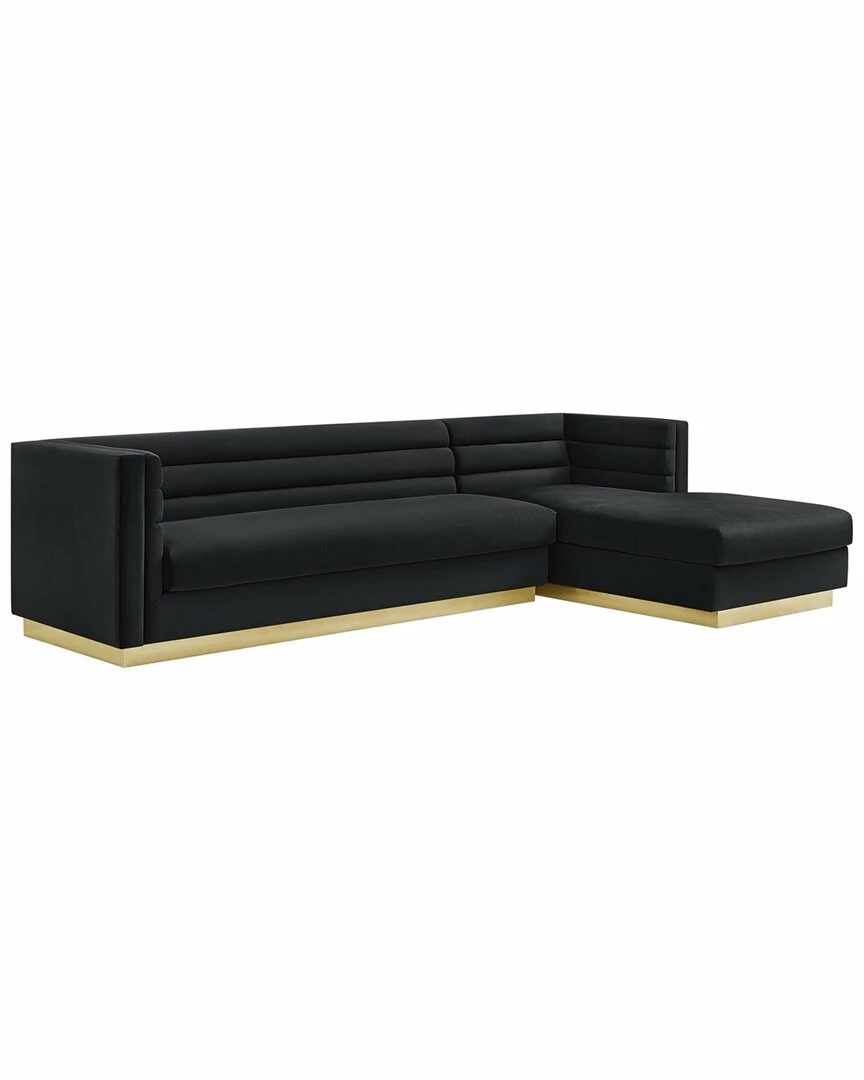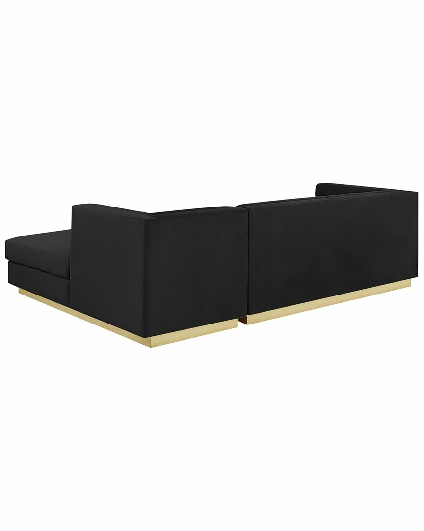 - Our velvet chaise sectional sofa brings a soft refinement to the boundaries of your living room, office or foyer. This simple yet attractive item provides a centerpiece color and design that blends easily with your main furniture to create a vibrant and warm indoor place to come home to. Straight lines, square arms, soft velvet handmade upholstery, cozy foam filling and a minimalist solid base with a gold or silver metal finish give this piece a unique modernist feel. The frame is comprised of a combination of solid wood and MDF, which makes the structure sturdy and durable, and high-quality sinuous springs installed inside the piece guarantee you comfortable seating.