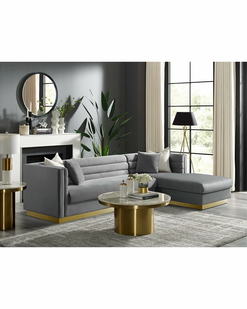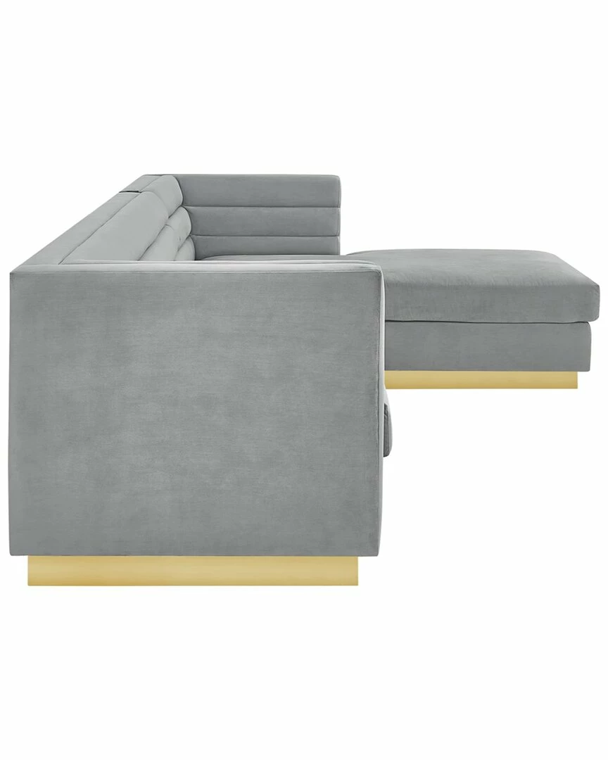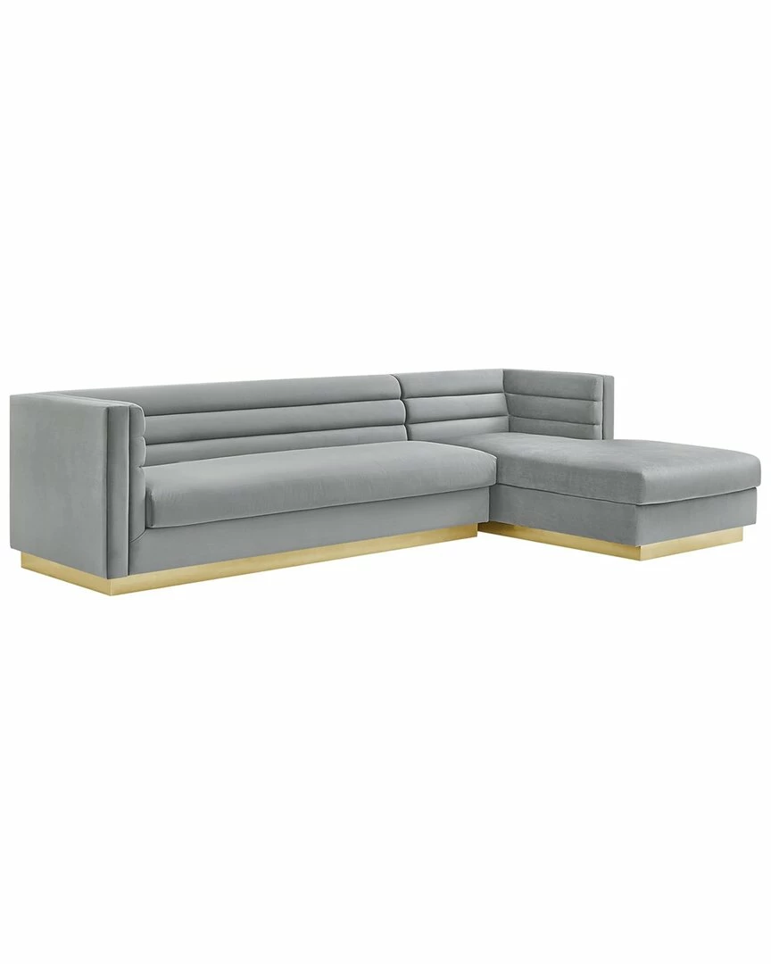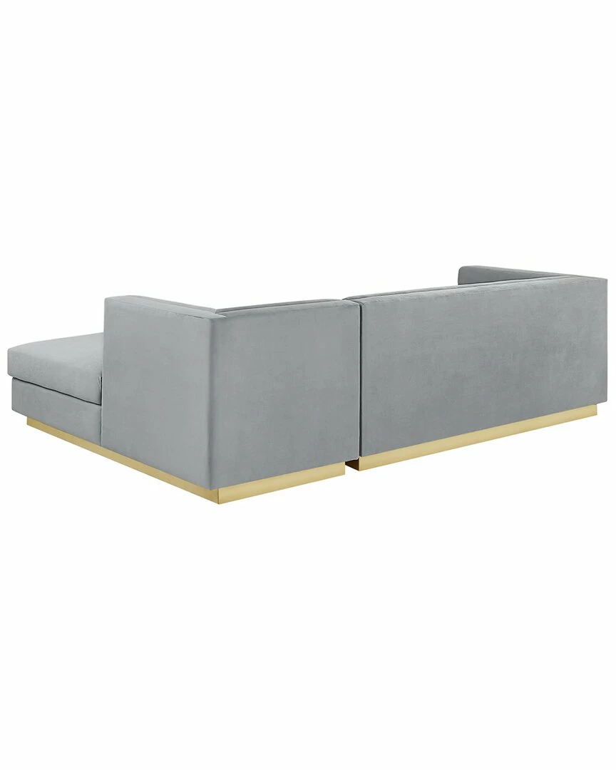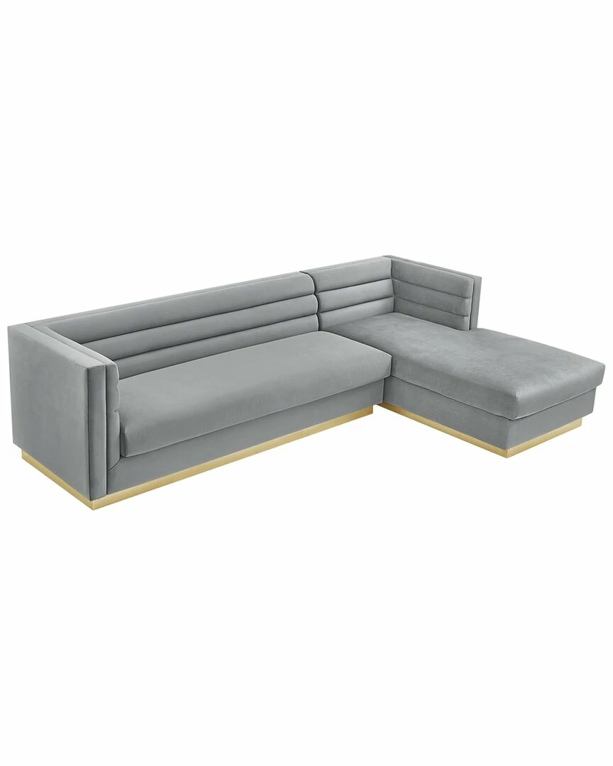 - Our velvet chaise sectional sofa brings a soft refinement to the boundaries of your living room, office or foyer. This simple yet attractive item provides a centerpiece color and design that blends easily with your main furniture to create a vibrant and warm indoor place to come home to. Straight lines, square arms, soft velvet handmade upholstery, cozy foam filling and a minimalist solid base with a gold or silver metal finish give this piece a unique modernist feel. The frame is comprised of a combination of solid wood and MDF, which makes the structure sturdy and durable, and high-quality sinuous springs installed inside the piece guarantee you comfortable seating.