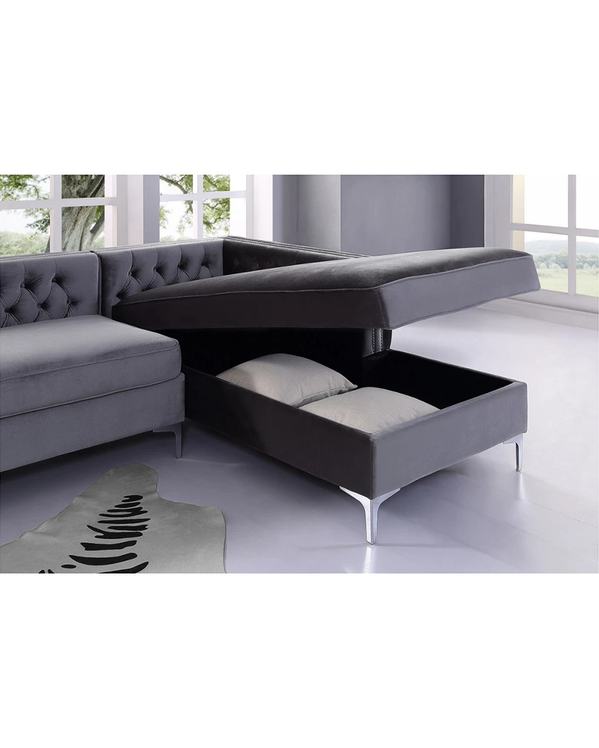 - Design details: Chrome construction; button tufted velvet fabric; silver nail head trim; square arms; high density foam padding; Y-shaped silver chrome metal legs; large storage compartment; three throw pillows included; sturdy plywood frame
