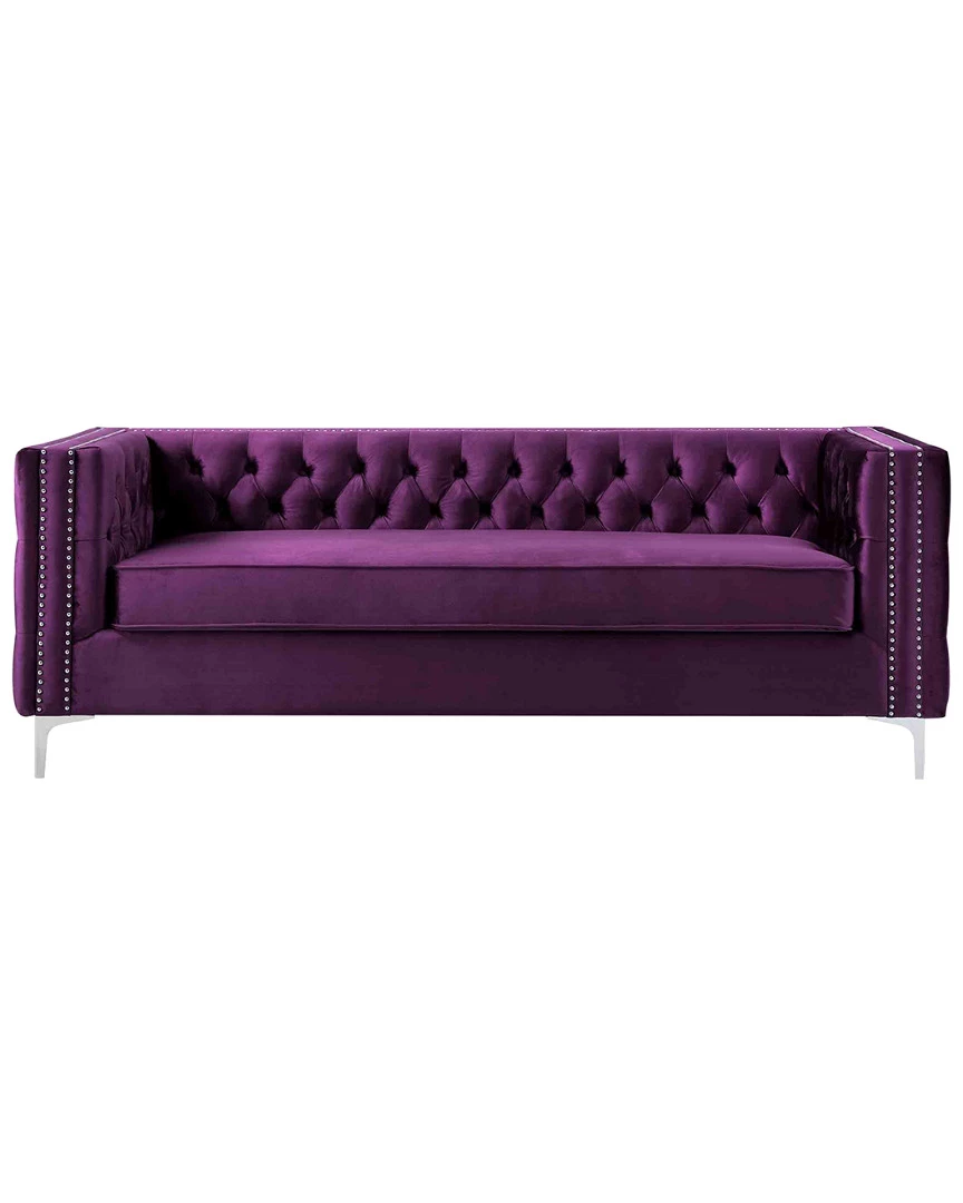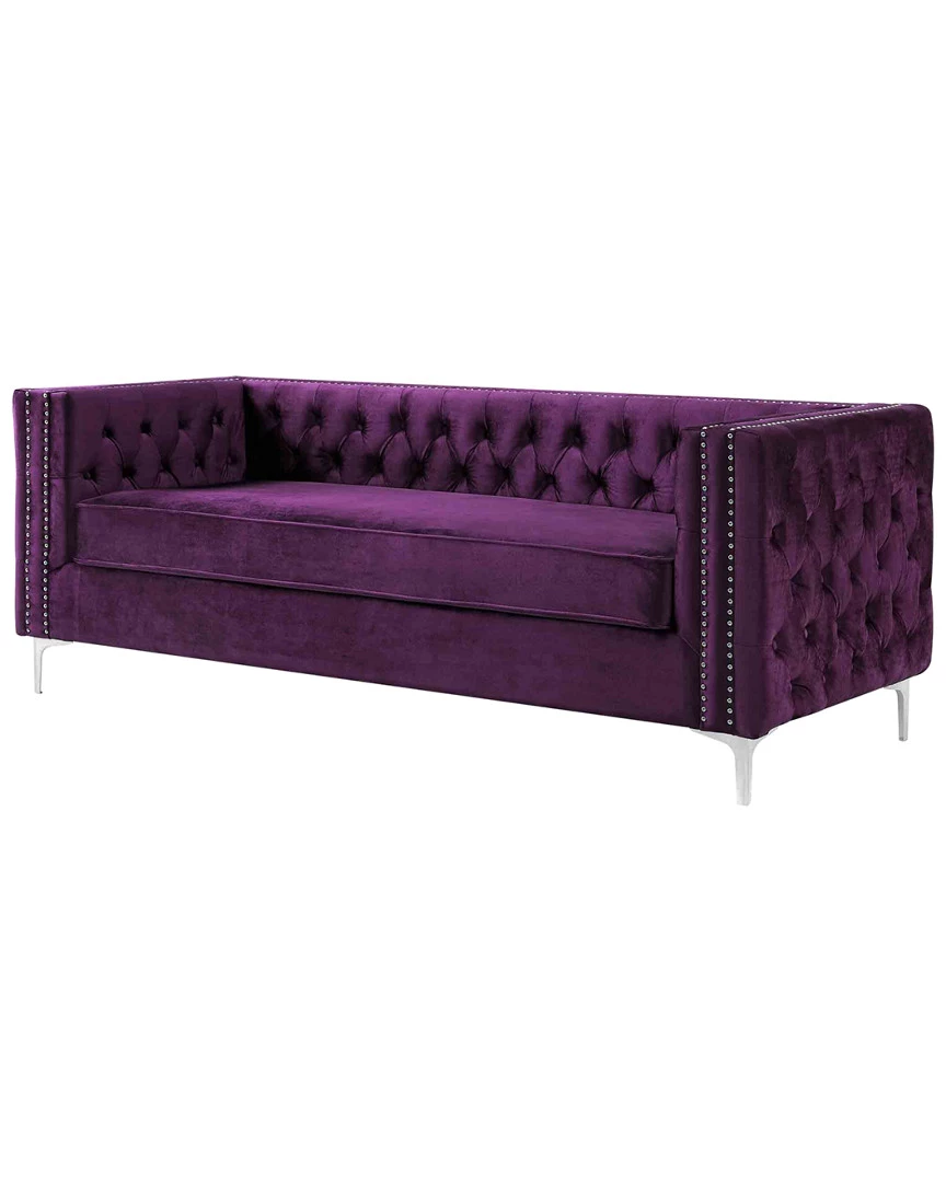 - Design details: Our 3-seat sofa will give your home the renaissance it deserves. Comfort and style is evident in this marvelous piece of furniture. It features rich hued button tufted velvet fabric with contrasting nailhead trim, clean square arms, high density foam padding and sturdy Y-shaped coordinating metal legs. With this gorgeous sofa, traditional meets modern and the result is nothing short of spectacular. Ultra comfortable and elegant. Easily assembled by crewing on the legs.