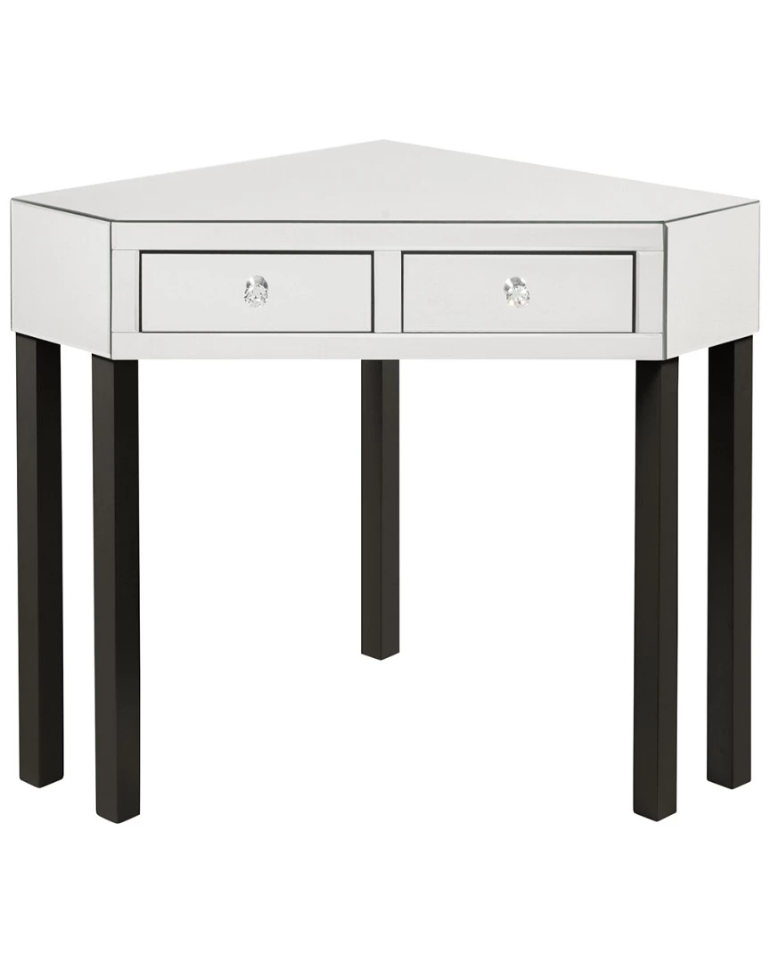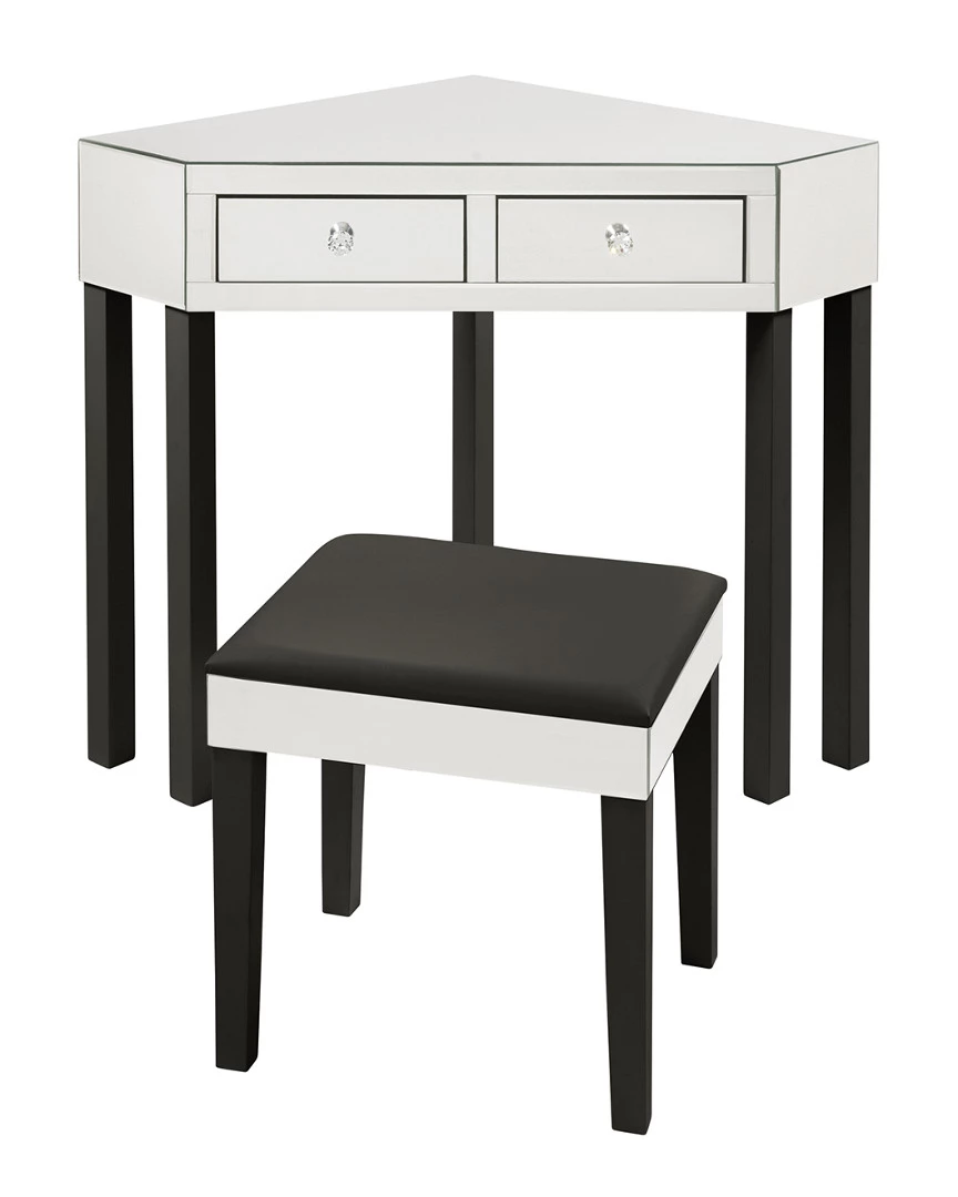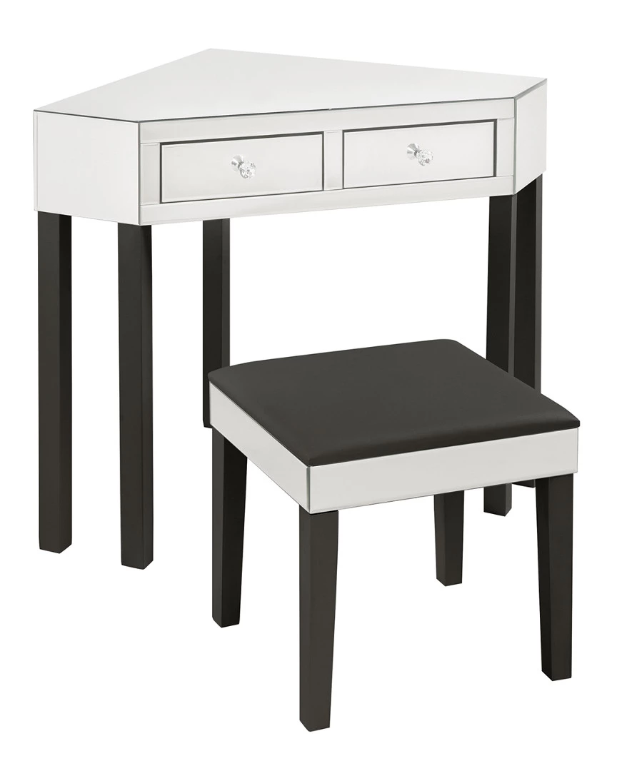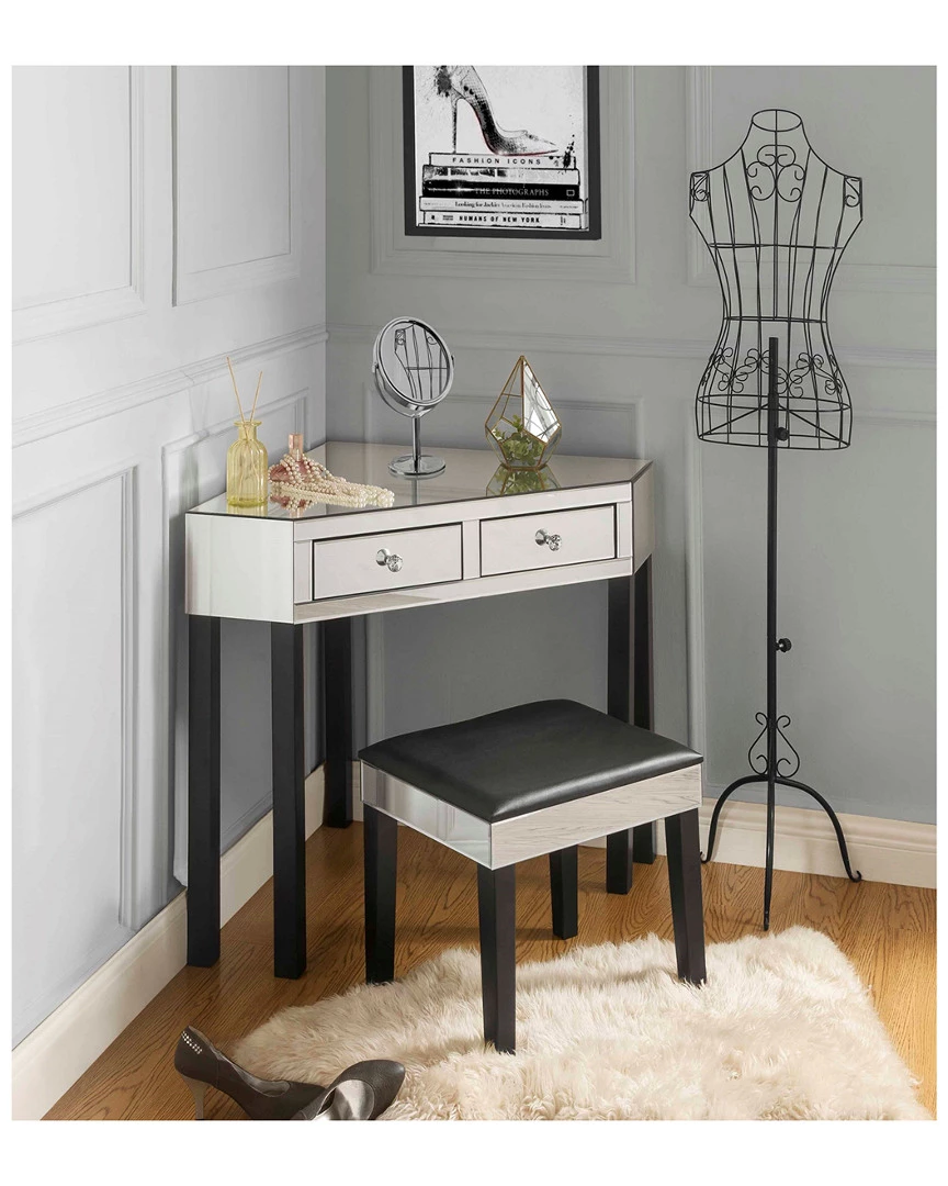 - Design details: Our chic mirrored vanity set/desk brings classic glamour to your room. This elegant furniture set is great for storing jewelry, cosmetics and makeup brushes. The stylish, contemporary design features two storage drawers with crystal knobs and a smooth mirrored tabletop. Matching chair makes it a complete set! The triangle mirrored top surface could also be a perfect display for a lovely floral arrangement, lamp, or family photos.