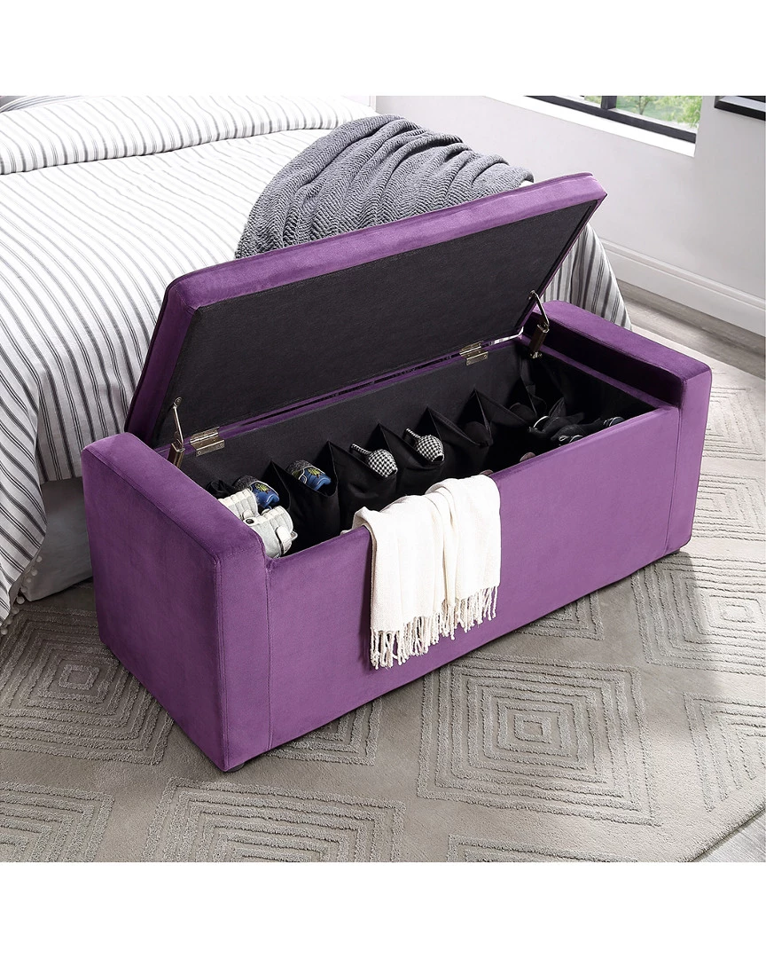 - Design details: plywood construction; hidden lift top storage with divided 20 pocket compartments; velvet upholstery