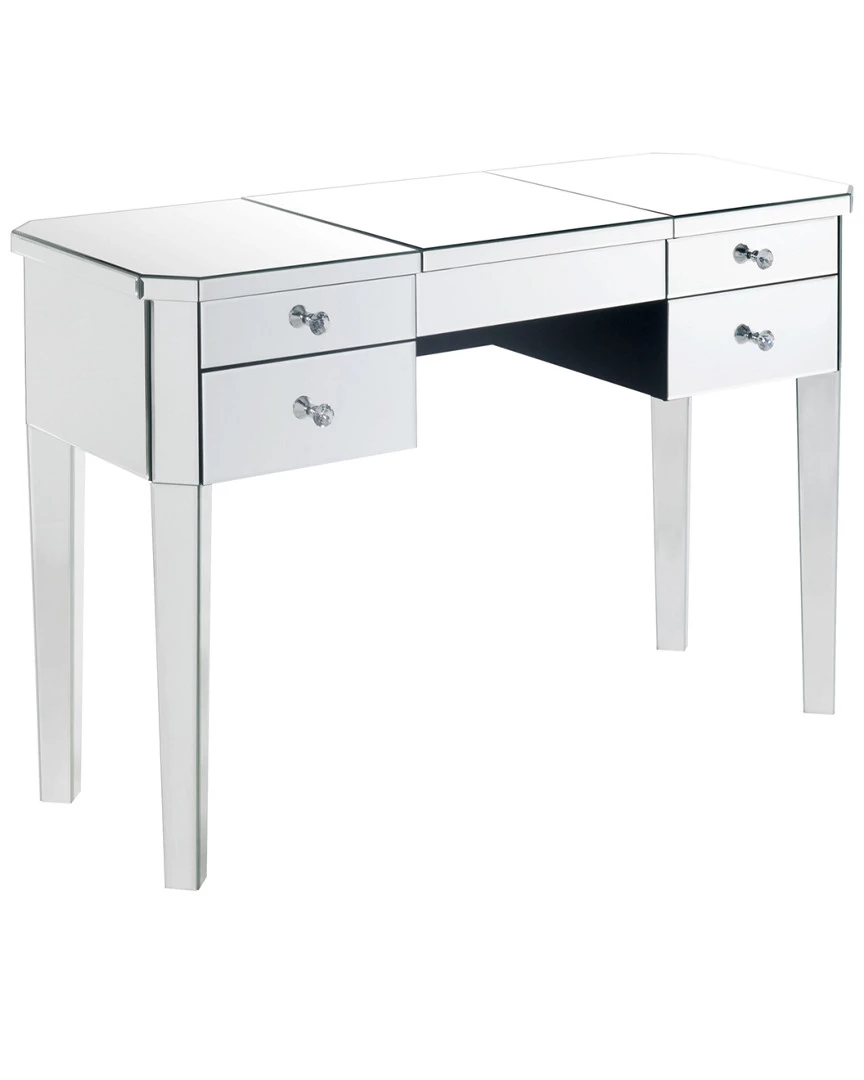 - Design details: Our chic mirrored makeup vanity table is a stylish addition to a bedroom or dressing area. This elegant furniture piece is great for storing jewelry, cosmetics and makeup brushes. Stylish contemporary design features four storage drawers and smooth mirrored table top with a flip top feature for additional ample interior storage area for cosmetics and beauty supplies. Flip down the mirror and you have a great desk for writing and working. It combines dressing table and writing desk in one. This piece is versatile enough to blend in with almost any type of decor while still making a distinct and elegant statement.