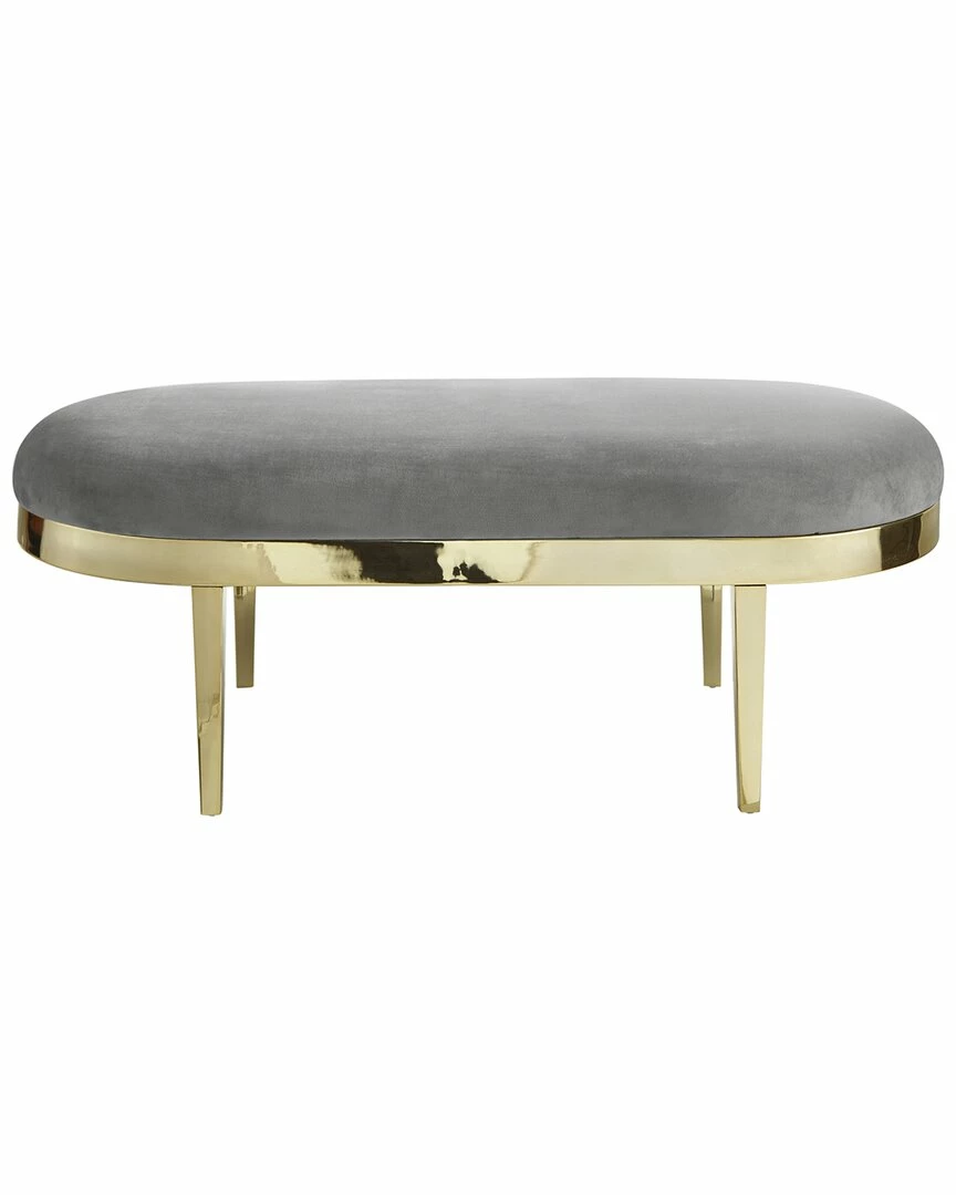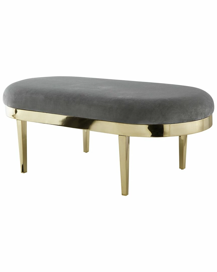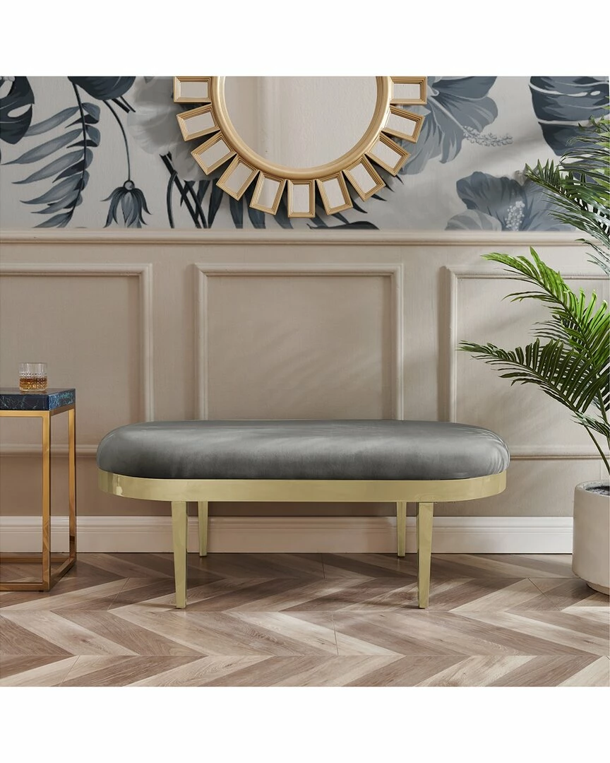 - Contemporary chic, the bench is sure to enhance any space in your home with its luxurious velvet upholstery. Add a touch of elegant glamor to any modern decor with this oval bench featuring exposed curved frame. This piece is constructed with high density foam for ultimate comfort and sleek, polished metal legs for durability. Place this bench in your living room, bedroom, or entryway to enhance the style and comfort at home.