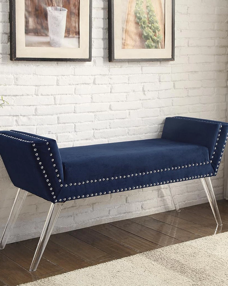 - Design details: Foam construction; velvet upholstery; nail head trim; clear acrylic legs; high density foam seating