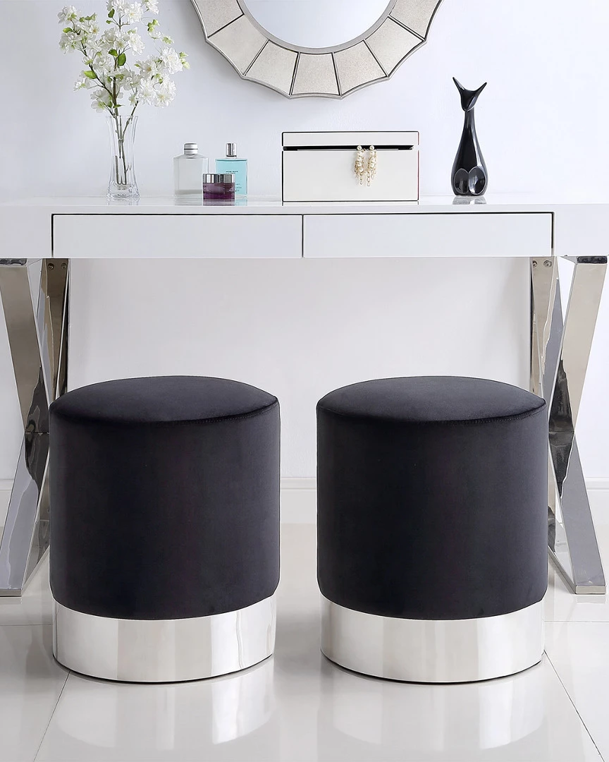 - Design details: Plywood construction; glossy metal base; velvet upholstered top; high density foam; sturdy plywood frame; 300lb weight capacity