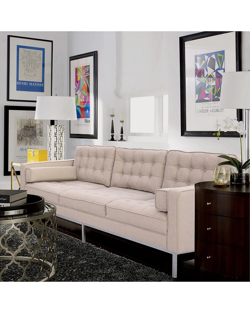 - Design details: Foam construction; deep button tufted linen; square arms; high density foam padding; straight silver tone chrome metal legs; two throw pillows included; plywood frame