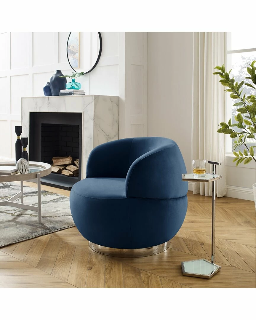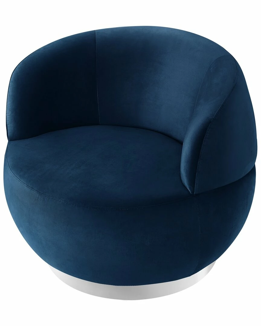 - The round swivel accent chair exudes elegance and refinement with its sleek back design. Its velvet or sherpa upholstery is luxurious to the touch and has a visual cascade of retro glitz. A rounded seat hugs the deep barrel shape for a warm and inviting appearance. The cushioned chair with rounded arms is ideal for your living room, entryway, bedroom, makeup room or lounge area, making it a perfect spot to sit back and relax.