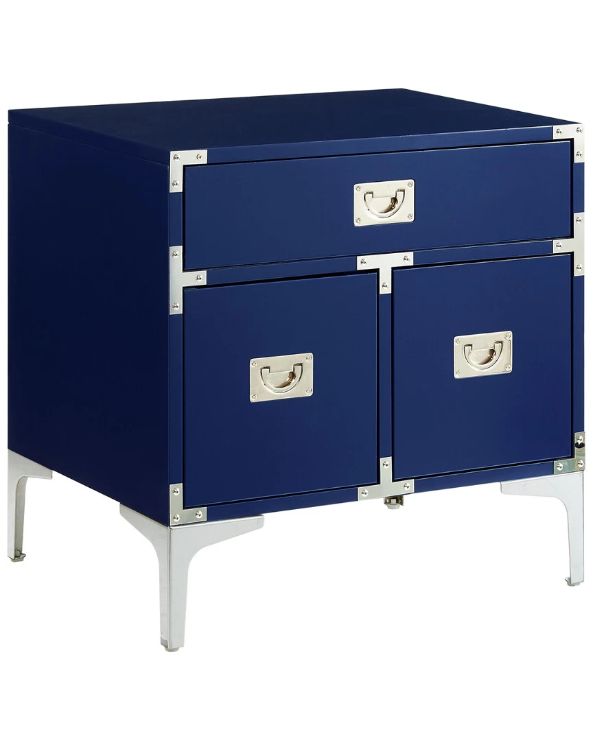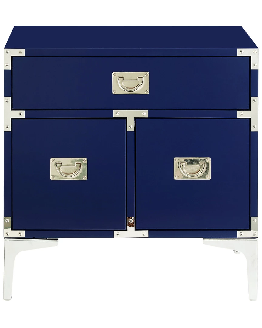 - Design details: MDF construction; lacquer finish; chrome legs; one drawer; two door compartments; decorative corner brackets; silver pull; doors feature a soft close mechanism