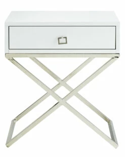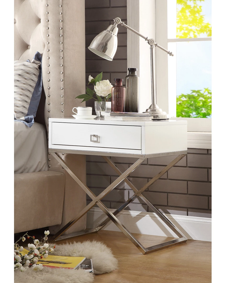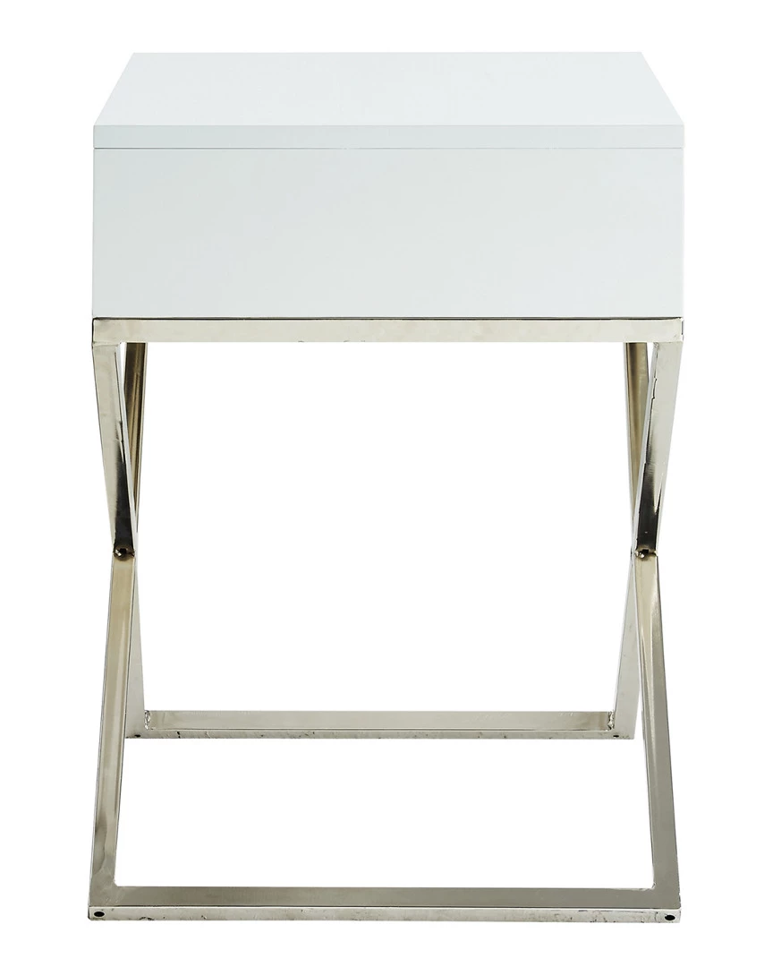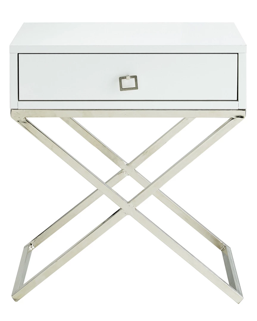 - Design details: MDF construction; lacquer finish with X-metal legs, gliding drawer with deco pull
