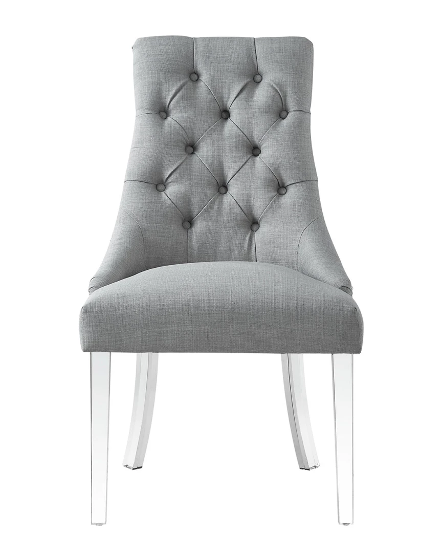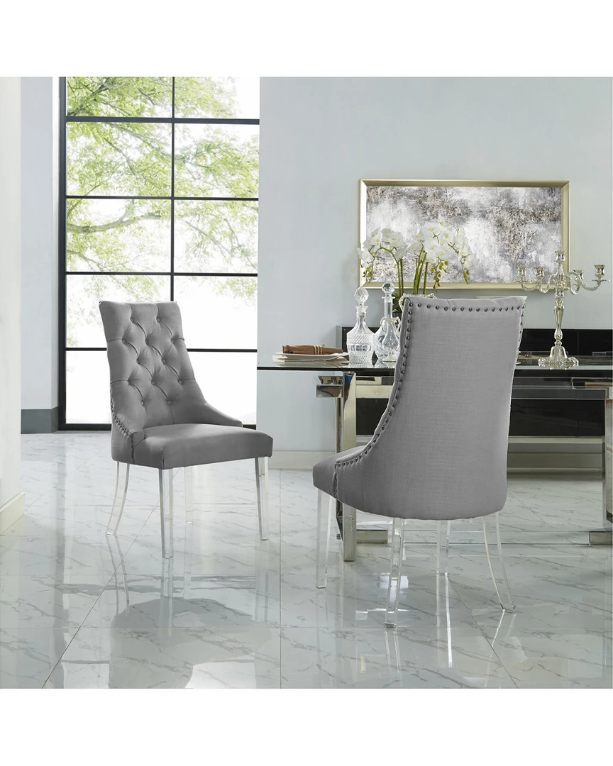 - Design details: Plywood construction; set of 2 dining chairs; upholstered; button tufted; Lucite acrylic legs; handmade nail head trim; plywood frame