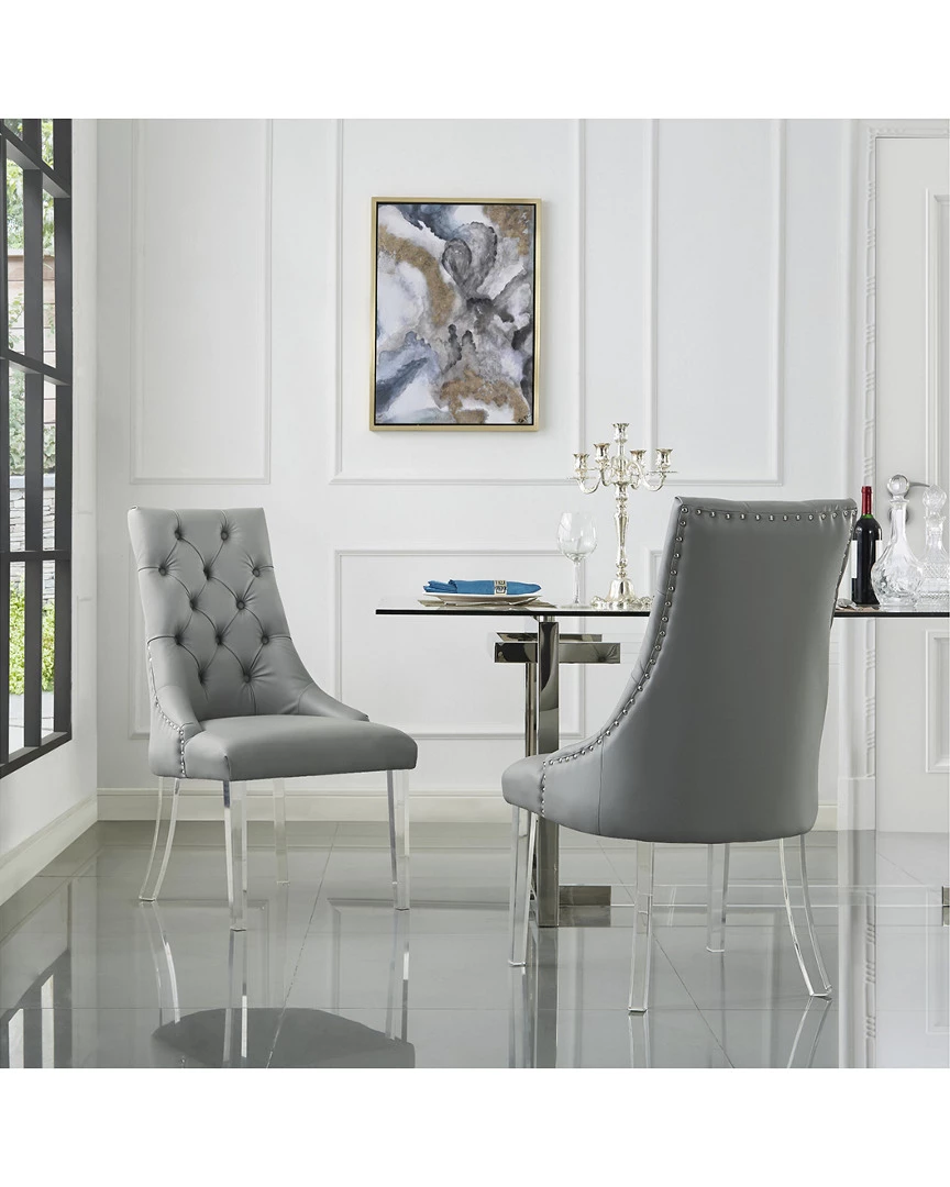 - Design details: Plywood construction; set of 2 dining chairs; upholstered; button tufted; Lucite acrylic legs; handmade nail head trim; plywood frame