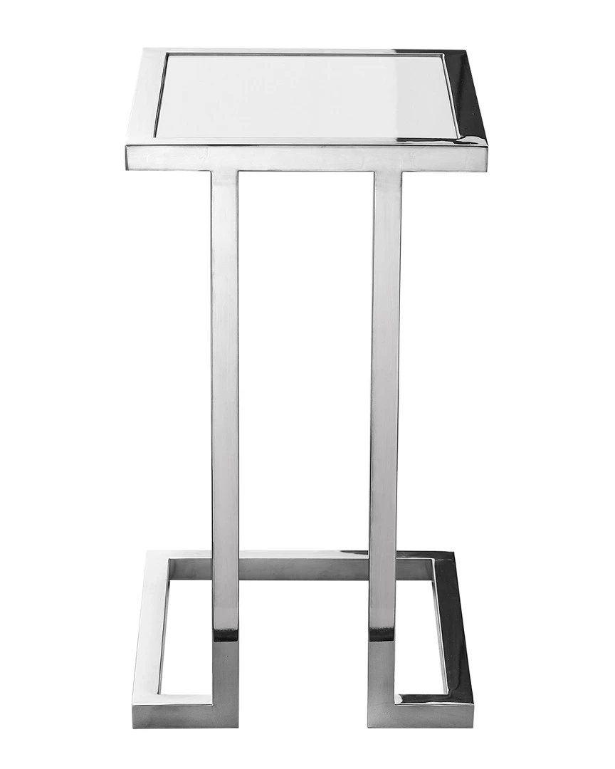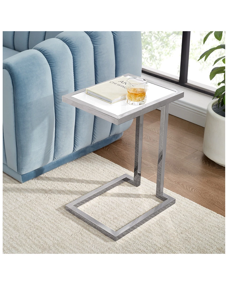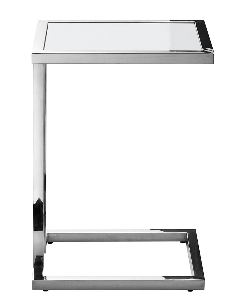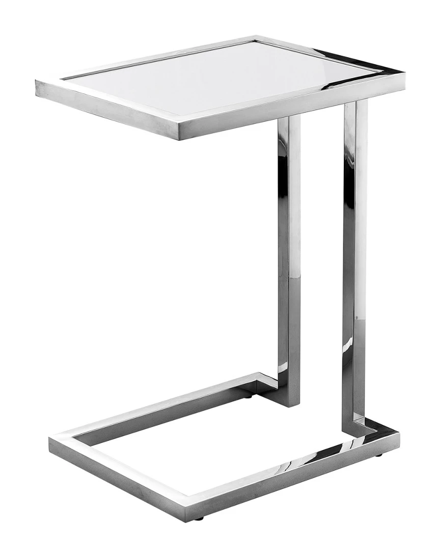 - Sleek and stylish combination of materials gives this end table a fresh contemporary look. The tables top has a high gloss lacquer finish while stainless steel base have a polished look. If you love the shiny modern style, this clean and glamorous C-table will immediately capture your attention, providing the look you want. This exquisite piece is an excellent solution for modern home. The C-shape of this versatile table is perfect for any room and allows you to slide the foot of the table under a chair or sofa while having a perfectly portioned top that is excellent for keeping snacks, drinks or books close at hand.