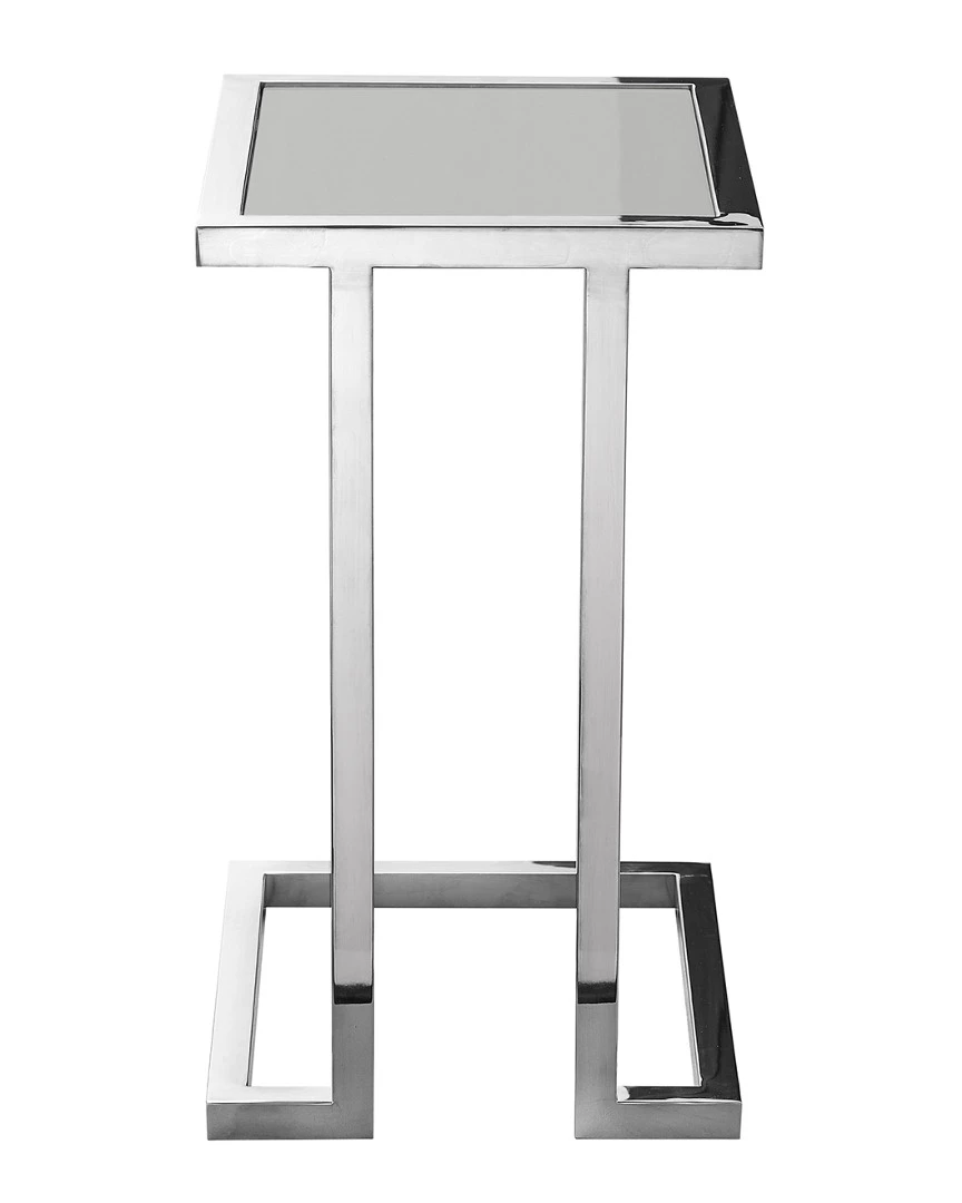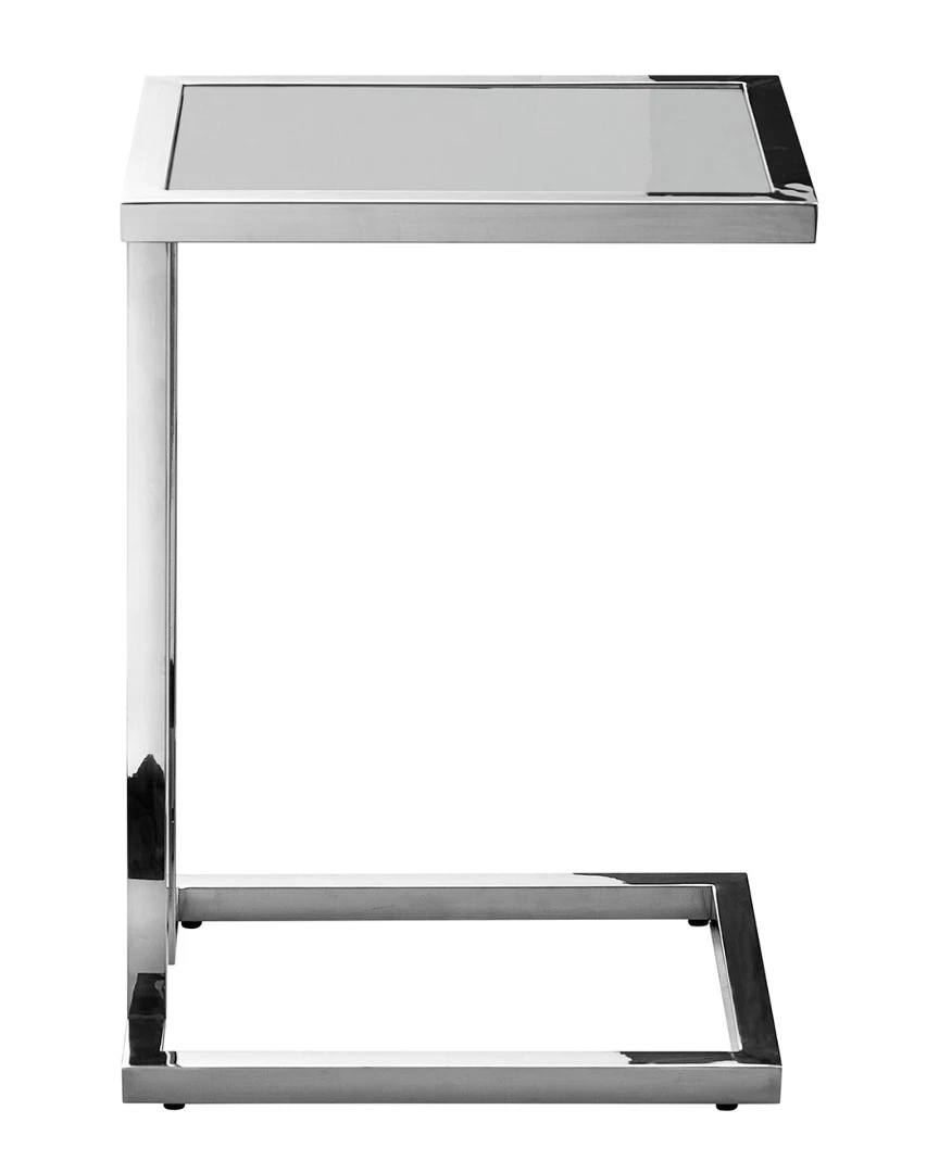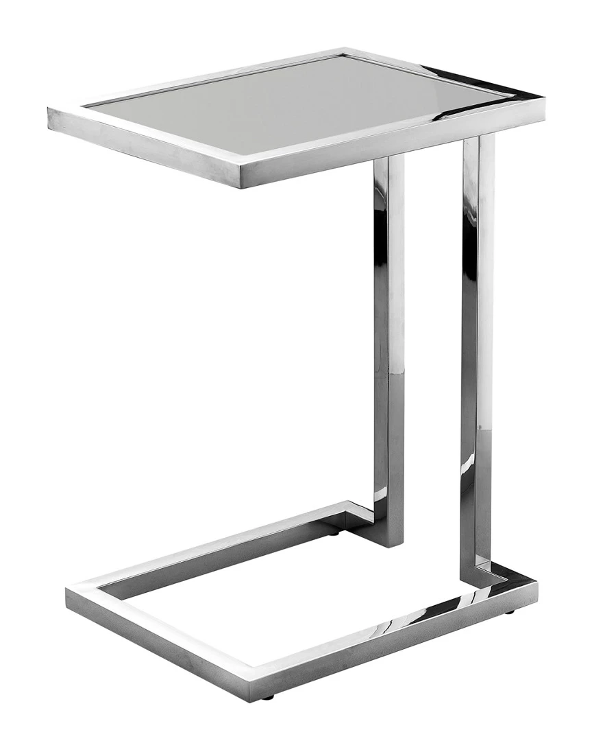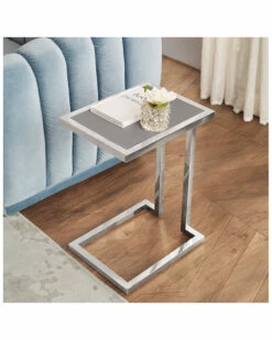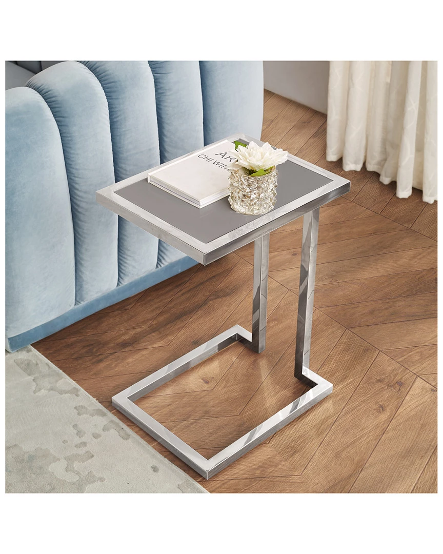 - Sleek and stylish combination of materials gives this end table a fresh contemporary look. The tables top has a high gloss lacquer finish while stainless steel base have a polished look. If you love the shiny modern style, this clean and glamorous C-table will immediately capture your attention, providing the look you want. This exquisite piece is an excellent solution for modern home. The C-shape of this versatile table is perfect for any room and allows you to slide the foot of the table under a chair or sofa while having a perfectly portioned top that is excellent for keeping snacks, drinks or books close at hand.
