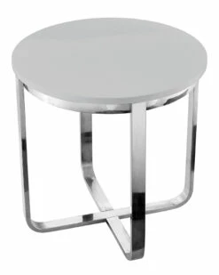 - Bring contemporary modern style into your home. This end/accent table is a perfect complement to a variety of interior decor. Use it as a side table next to your chair or sofa or even as a nightstand in a bedroom. It is constructed of MDF top with a high gloss lacquer finish and stainless steel shiny clean-lined base. Show off favorite decorative items, let it hold a warm cup of coffee while reading or let it anchor a bold lamp and magazines next to a favorite chair. This modern side table will be a favorite piece for years to come.
