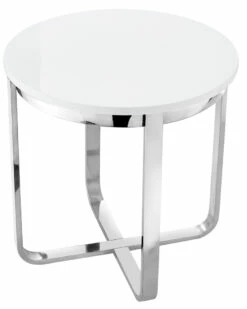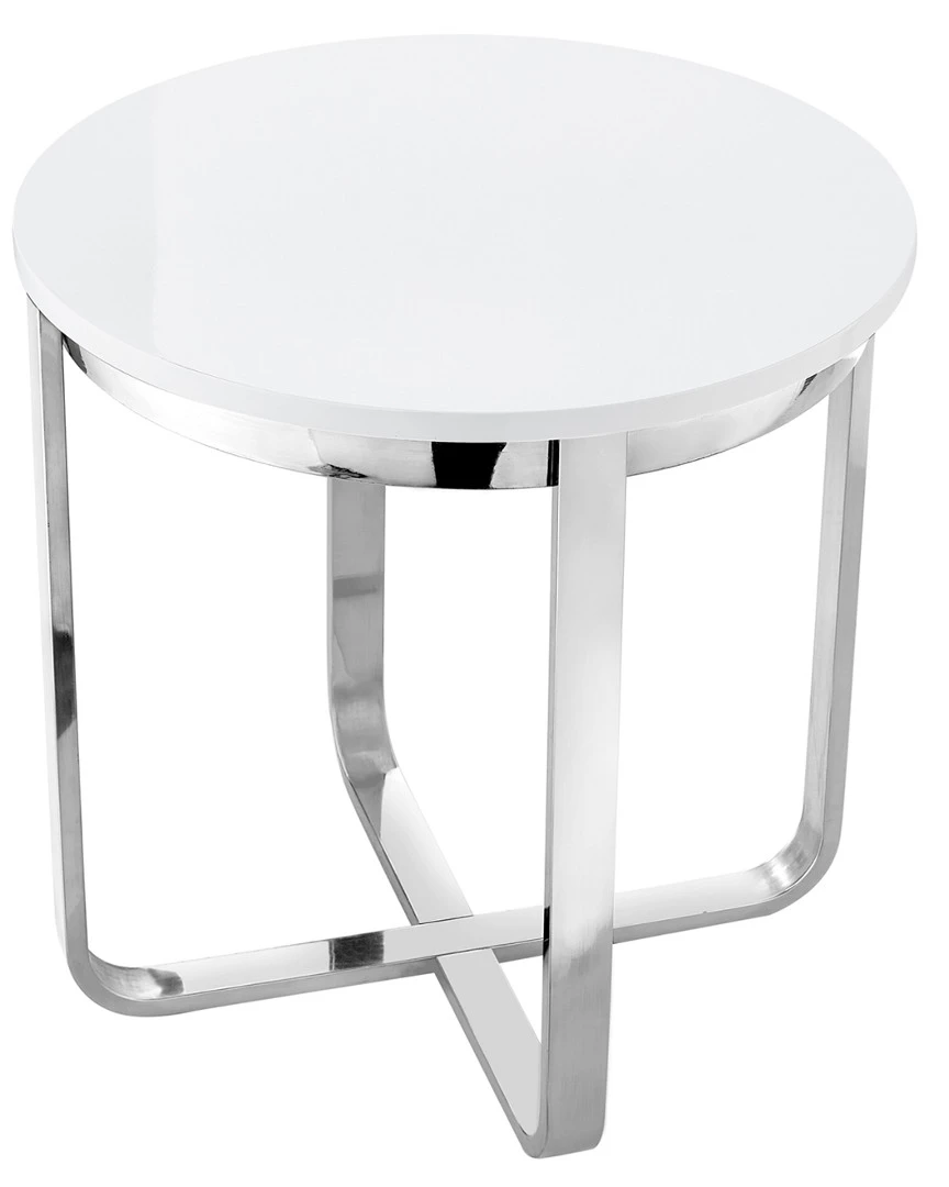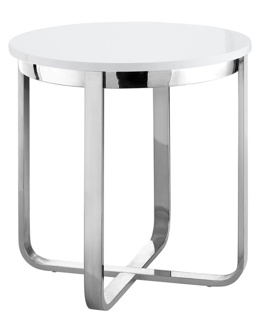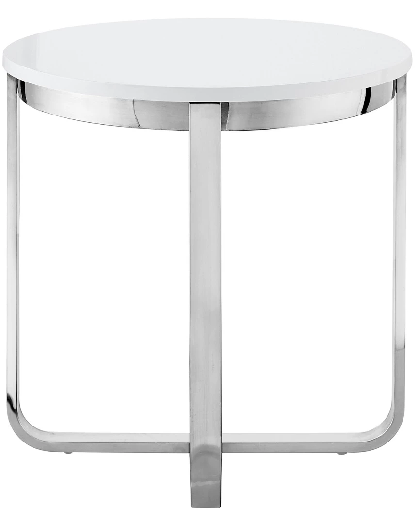 - Bring contemporary modern style into your home. This end/accent table is a perfect complement to a variety of interior decor. Use it as a side table next to your chair or sofa or even as a nightstand in a bedroom. It is constructed of MDF top with a high gloss lacquer finish and stainless steel shiny clean-lined base. Show off favorite decorative items, let it hold a warm cup of coffee while reading or let it anchor a bold lamp and magazines next to a favorite chair. This modern side table will be a favorite piece for years to come.