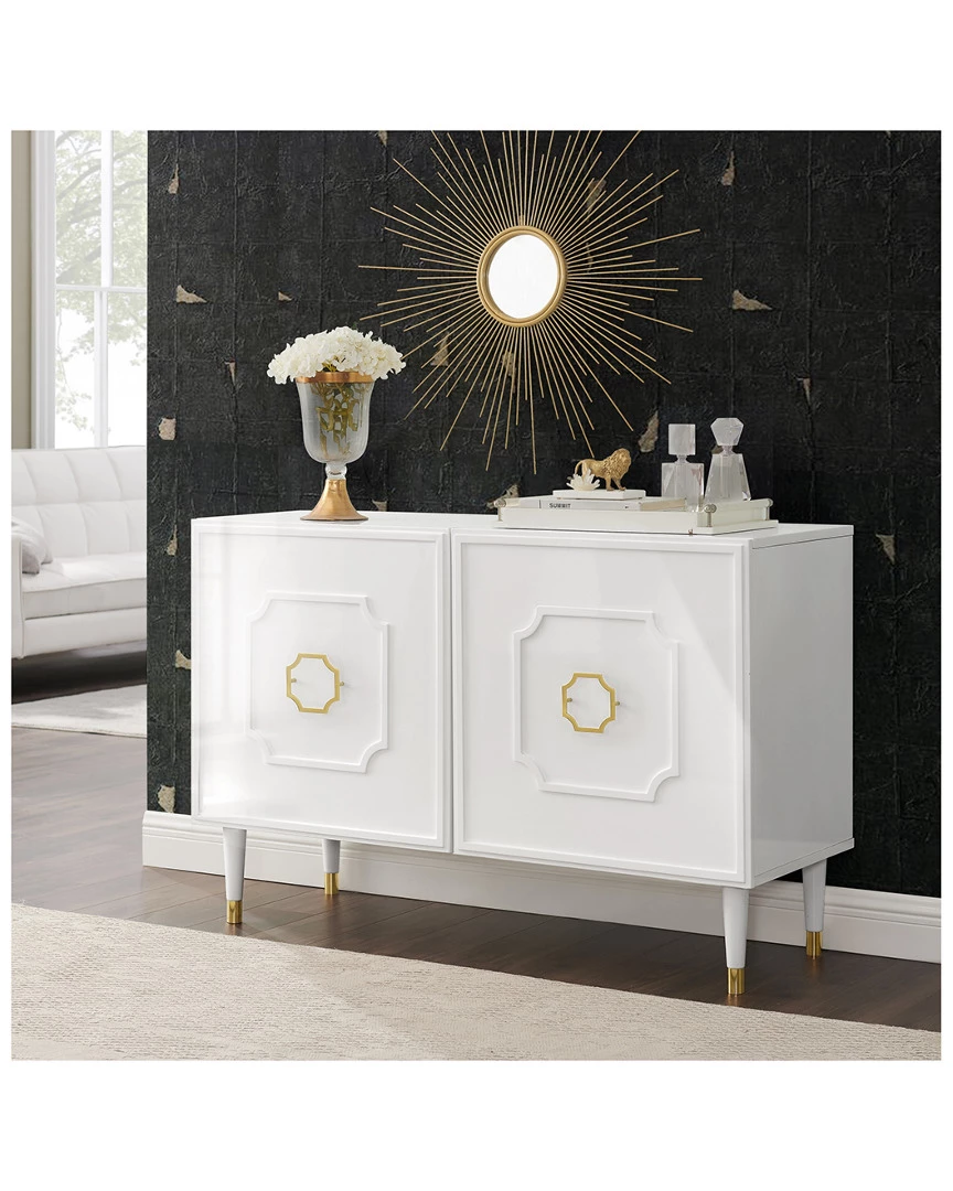 - This gleaming modern lacquer finish sideboard/buffet is perfect for your home or office. It deserves to be the center of attention in your living room, dining room, kitchen or office and to stand out from the rest. This inspired elegant piece features cabinet doors with the stainless steel brushed gold plating handles and leg tips which blend functionality into any home decor. Its shelving storage is perfect for keeping items safely tucked away. You can also display items like decorative plants and photos of your family and friends. This cabinet includes adjustable shelves that can move to different heights to create flexible storage options for items of all shapes and sizes. Versatile with its contemporary clean lines this cabinet brings a unique and exceptional feel to your home.