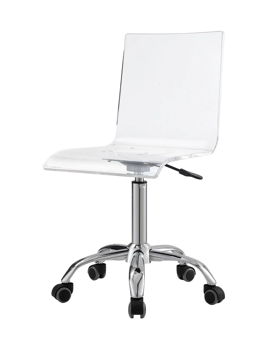 - Design details: If you are looking to create a trendy and fun look for your office, makeup room, studio, dining room or bedroom, this chair delivers a perfect combination of elegance and functionality. The transparent design emphases your living spaces color scheme with a subtle, sleek presence. For the convenience of your operation, the chair features wheel casters to move smoothly over a variety of surfaces and prevent scratching. The transparency of the chair allows it to take up less space visually as with a solid chair.