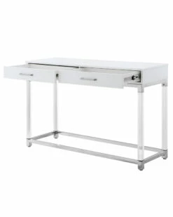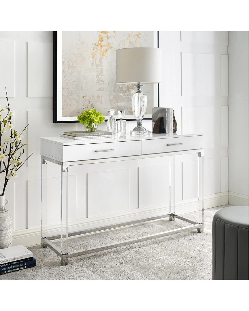 - Design details: The unusual design of this console table makes it a striking addition to any space, creating shimmering and lustrous appeal. Crafted from durable eco-friendly MDF with in a sleek high gloss finish, acrylic legs, stainless steel metal frame with matching handles, this elegant 2 drawer piece is an excellent solution for the modern home. Ample 2-drawer storage is perfect for organizing. Our console table will add depth to your living room, entryway or dining room, making an unforgettable impression on all your guests.