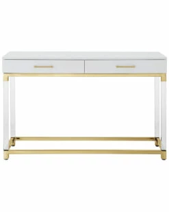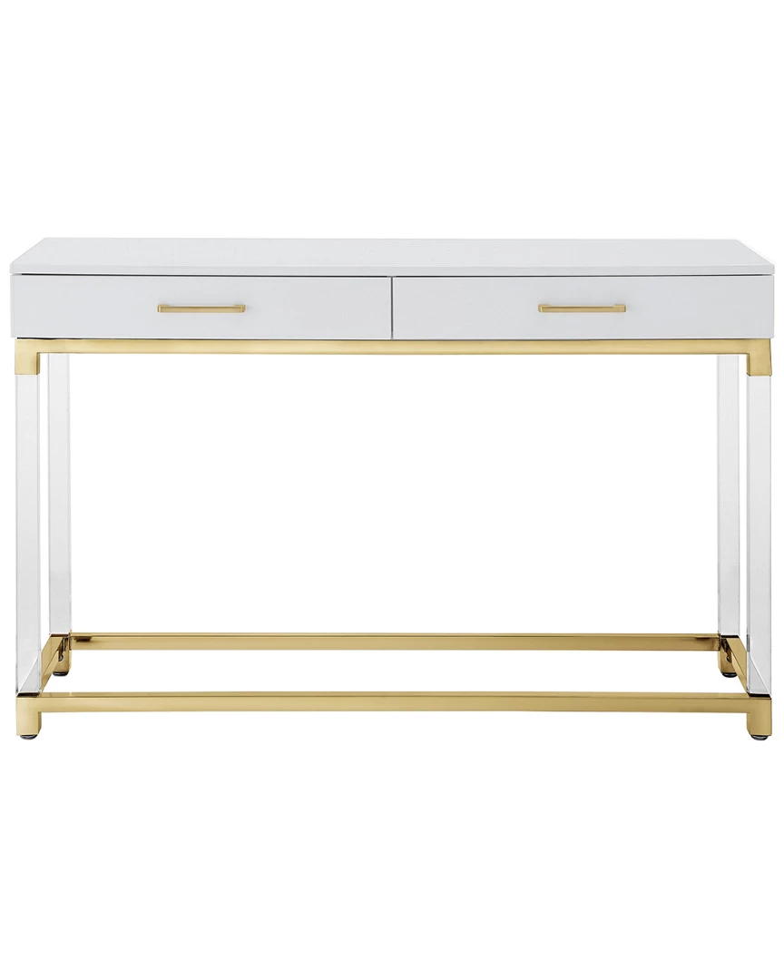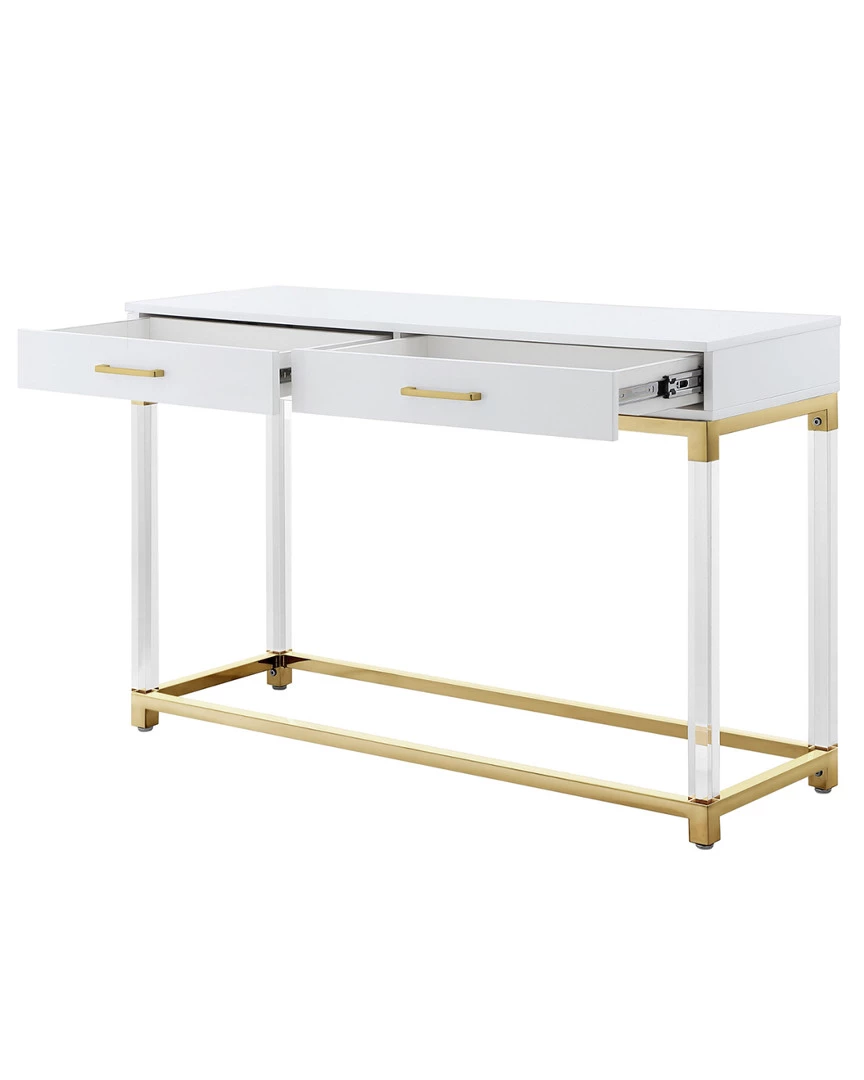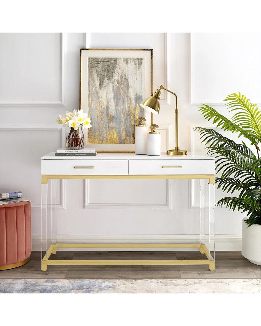 - Design details: The unusual design of this console table makes it a striking addition to any space, creating shimmering and lustrous appeal. Crafted from durable eco-friendly MDF with in a sleek high gloss finish, acrylic legs, stainless steel metal frame with matching handles, this elegant 2 drawer piece is an excellent solution for the modern home. Ample 2-drawer storage is perfect for organizing. Our console table will add depth to your living room, entryway or dining room, making an unforgettable impression on all your guests.