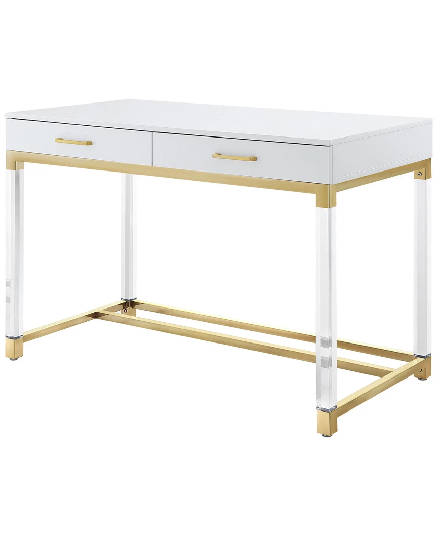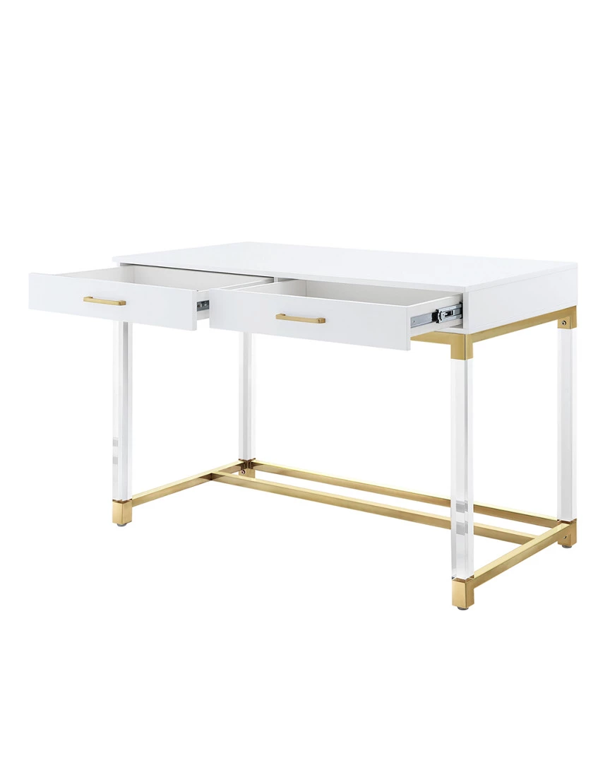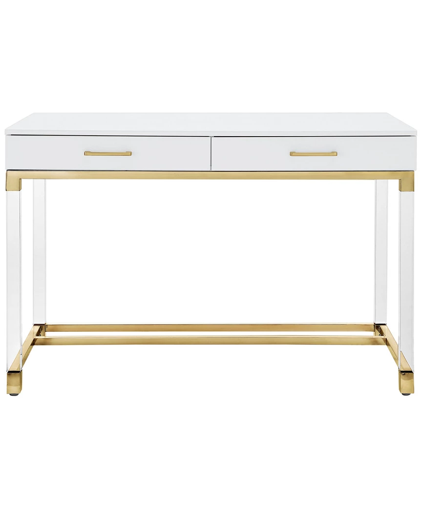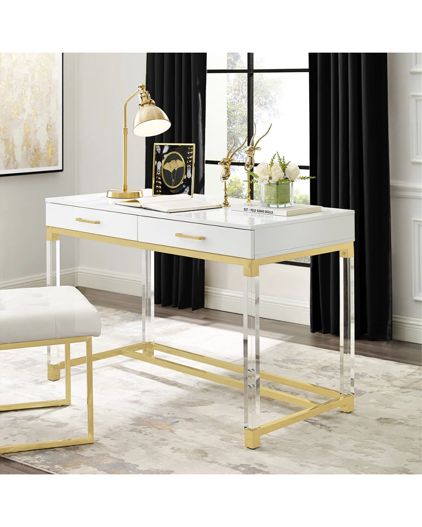 - Design details: The unusual design of this writing desk/vanity/makeup table/computer desk/console table make it a striking addition to any space, creating shimmering and lustrous appeal. Crafted from durable eco-friendly MDF with in a sleek high gloss finish, acrylic legs, stainless steel polished base frame with matching handles, this elegant 2 drawer piece is an excellent solution for the modern home. Smooth gliding drawers are perfect for organizing living essentials.