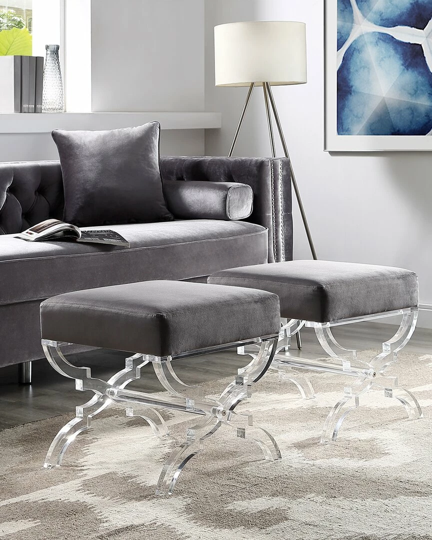 - Design details: Our acrylic X-leg ottoman adds a gentle sophistication in the confines of your living room, bedroom or entryway. Featuring a velvet upholstered high density foam cushioned seat and steady x-leg acrylic base, this elegant accent piece provides both functionality and a focal point of color and style that seamlessly blend with your main furniture to create a dynamic and cozy interior space to come home to.