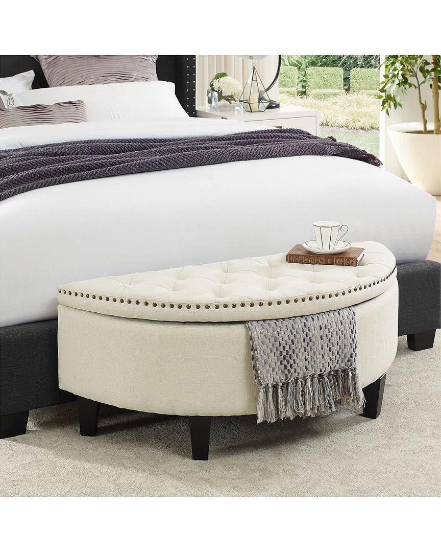 - Design details: Foam construction; button tufting; crisp linen fabric; gold tone nail head trim; lift top with safety hinge; storage compartment; wooden legs; plywood frame