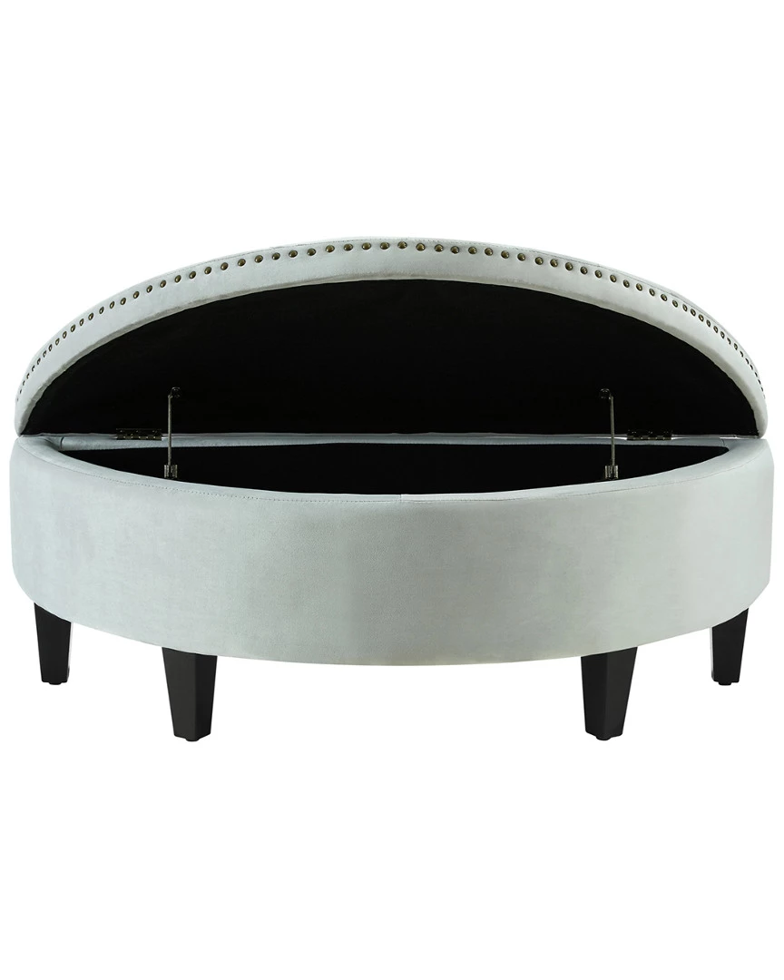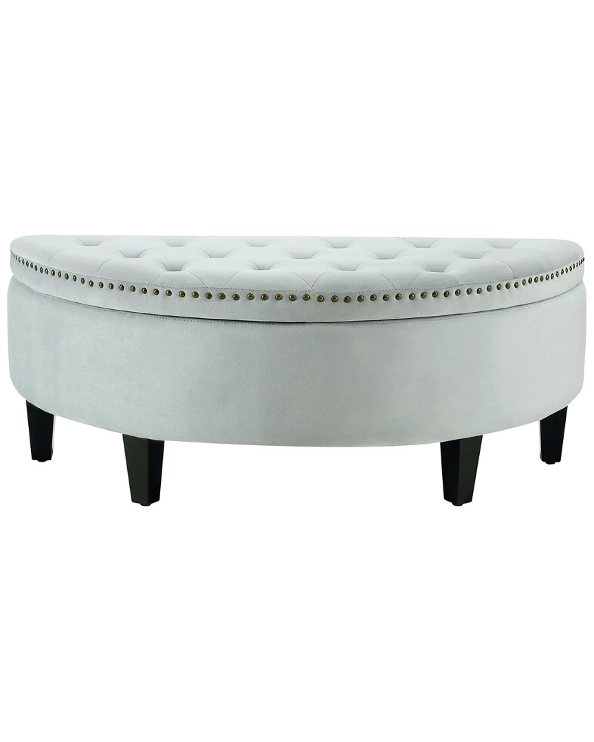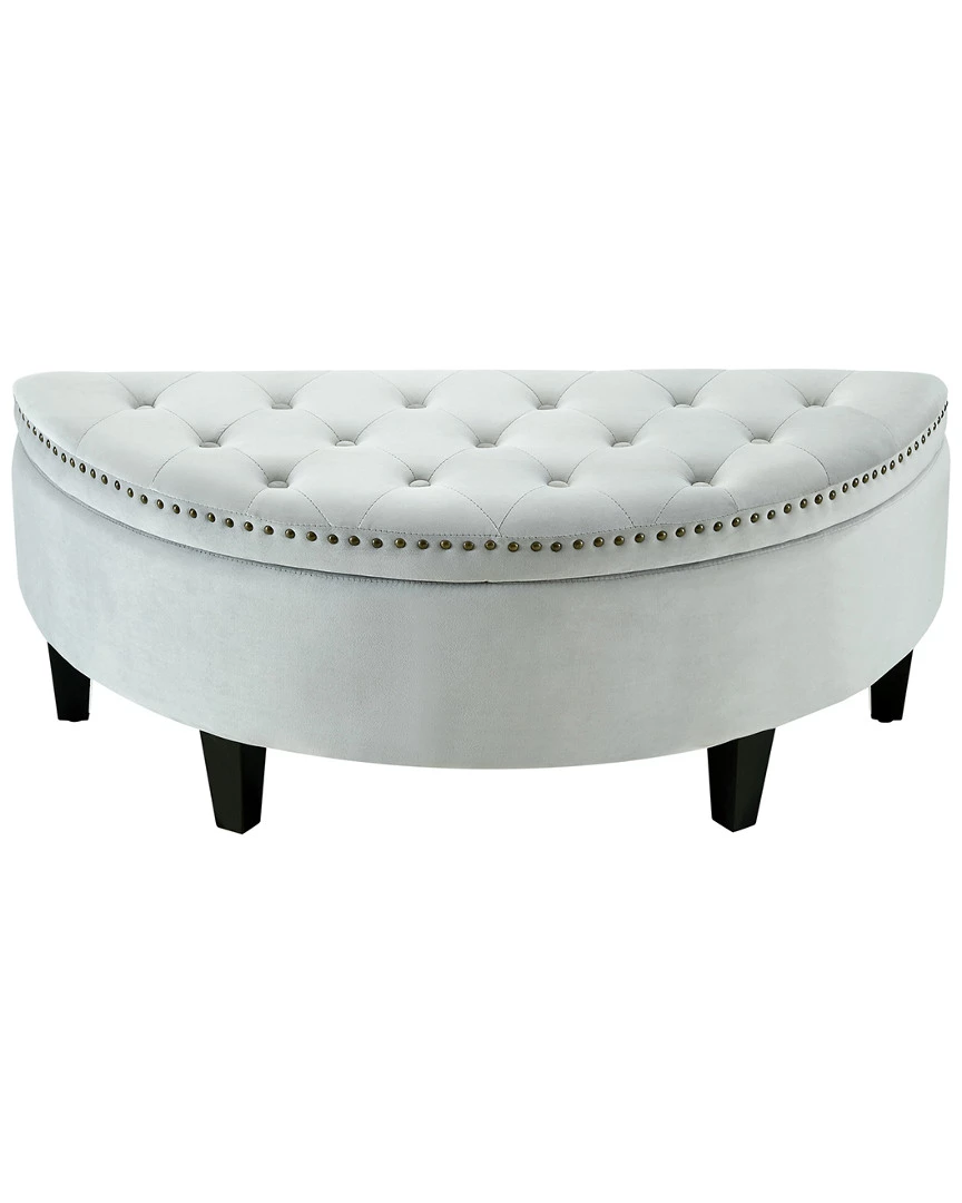 - Design details: Foam construction; button tufting; soft velvet fabric; gold tone nail head trim; lift top with safety hinge; storage compartment; wooden legs; plywood frame