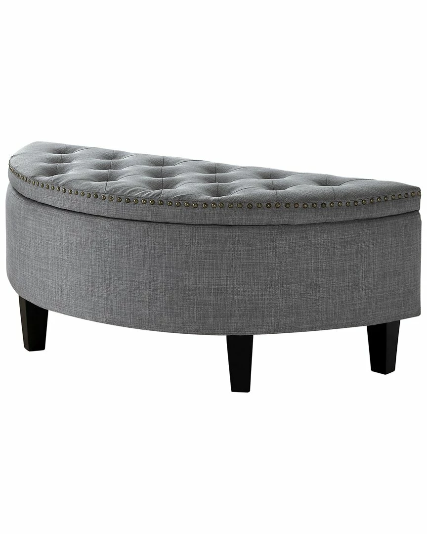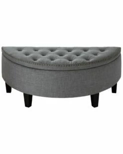 - Beautiful half-moon shape ottoman with a fashionable button tufting on top adds a contemporary yet reserved touch to your living room or bedroom. Featuring crisp linen fabric with contrasting goldtone nailhead trim this piece includes a lift top with safety hinges that opens to a spacious storage compartment. This space saving ottoman is the perfect height for a variety of uses and it features an exotic look that matches any style room to create an inviting and comfortable atmosphere to come home to.