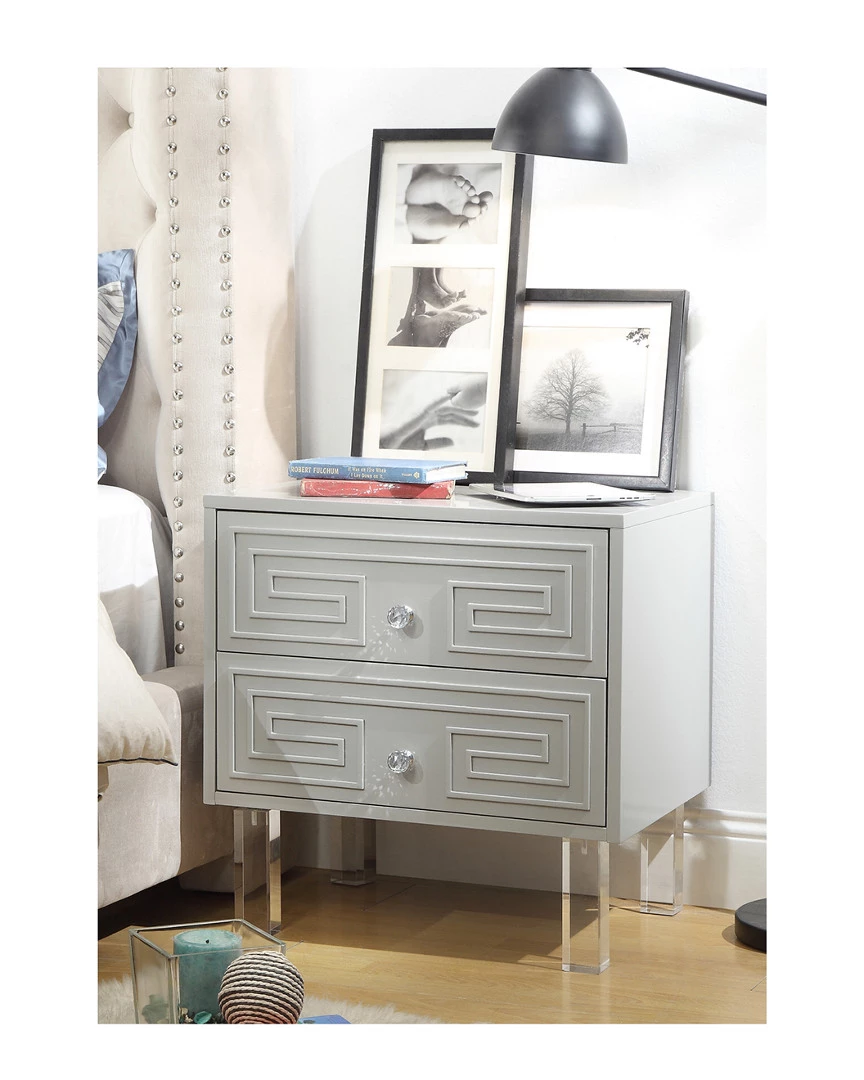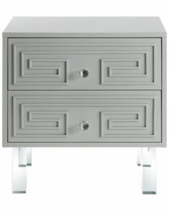- Design details: MDF construction; lacquer finish; Lucite legs; two gliding drawers with Lucite pulls