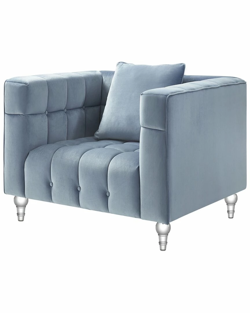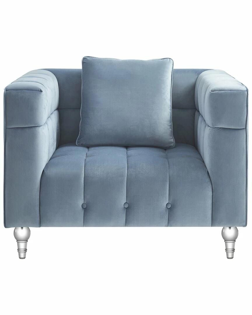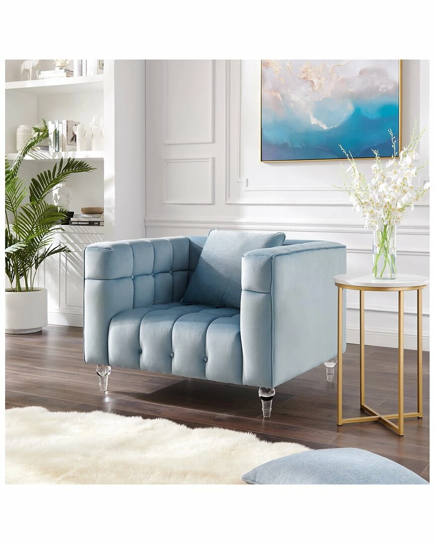 - Choosing the right piece for your home can instantly transform a dull room into a spectacular one. Blending traditional design with a touch of contemporary flair, this club chair is a perfect finishing touch to create a dynamic and cozy interior home space. Straight lines, square arms, soft velvet handmade upholstery, biscuit button tufting and clear acrylic legs makes a brilliant combination for a perfect modern statement piece. Frame is made of combined solid wood and manufactured wood, which makes construction to be firm and stable, and sinuous springs give a nice support as you sit.
