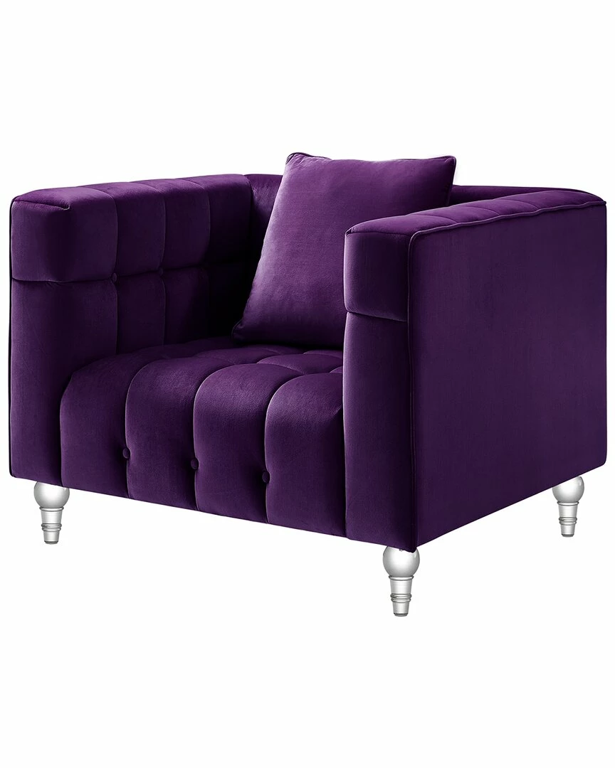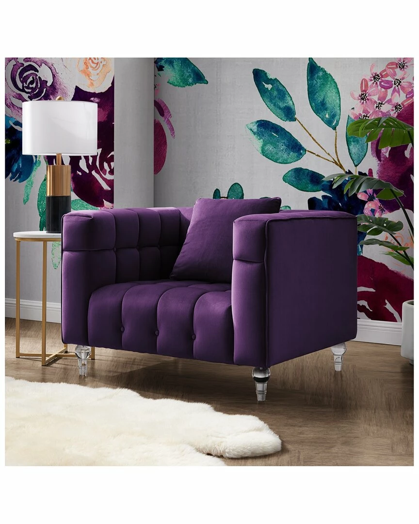 - Choosing the right piece for your home can instantly transform a dull room into a spectacular one. Blending traditional design with a touch of contemporary flair, this club chair is a perfect finishing touch to create a dynamic and cozy interior home space. Straight lines, square arms, soft velvet handmade upholstery, biscuit button tufting and clear acrylic legs makes a brilliant combination for a perfect modern statement piece. Frame is made of combined solid wood and manufactured wood, which makes construction to be firm and stable, and sinuous springs give a nice support as you sit.