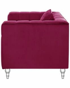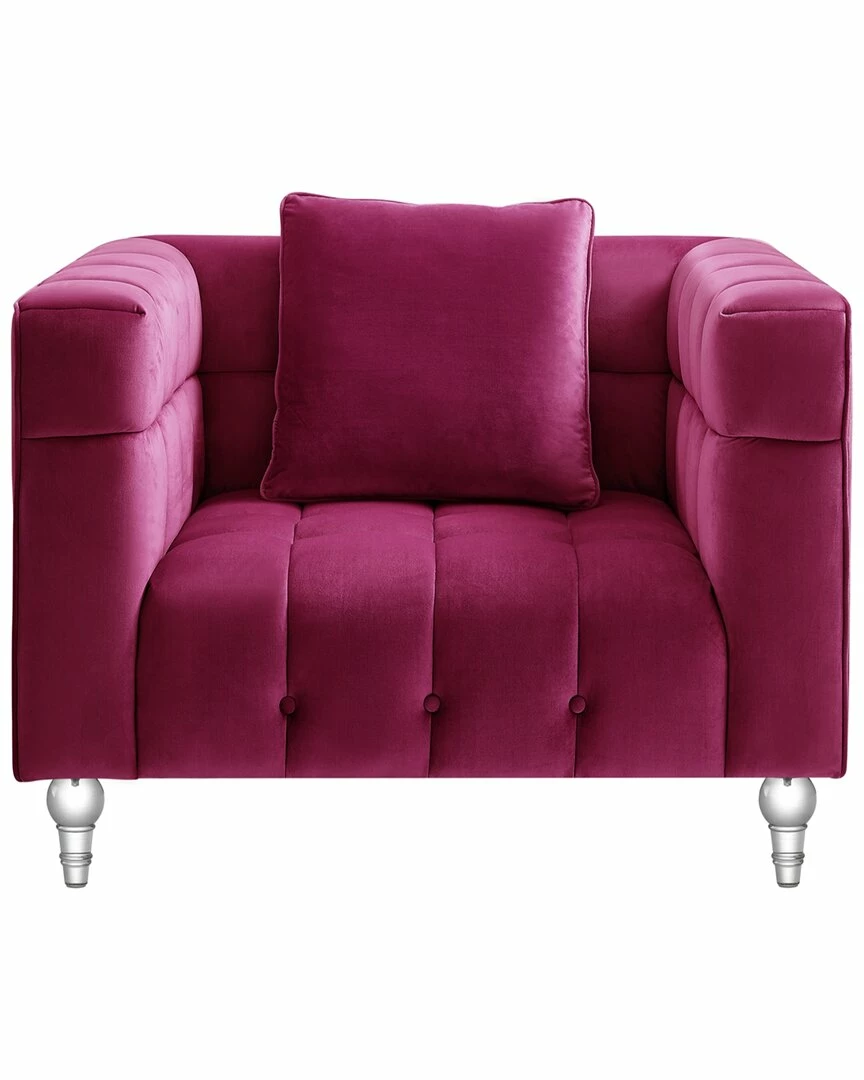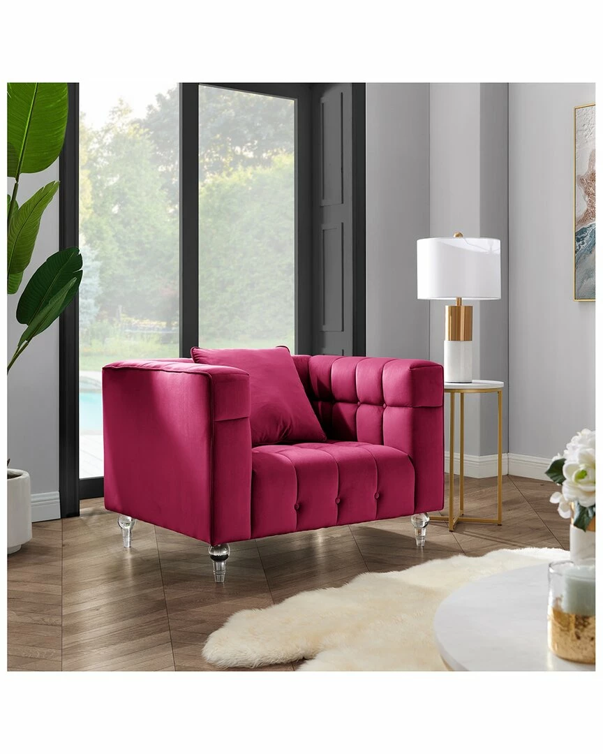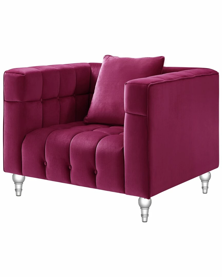 - Choosing the right piece for your home can instantly transform a dull room into a spectacular one. Blending traditional design with a touch of contemporary flair, this club chair is a perfect finishing touch to create a dynamic and cozy interior home space. Straight lines, square arms, soft velvet handmade upholstery, biscuit button tufting and clear acrylic legs makes a brilliant combination for a perfect modern statement piece. Frame is made of combined solid wood and manufactured wood, which makes construction to be firm and stable, and sinuous springs give a nice support as you sit.