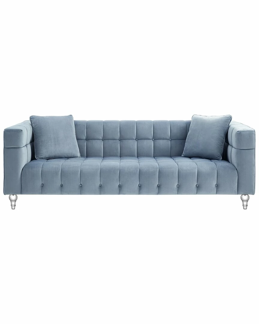 - Choosing the right piece for your home can instantly transform a dull room into a spectacular one. Blending traditional design with a touch of contemporary flair, this sofa is a perfect finishing touch to create a dynamic and cozy interior home space. Straight lines, square arms, soft velvet handmade upholstery, biscuit button tufting and clear acrylic legs makes a brilliant combination for a perfect modern statement piece. Frame is made of combined solid wood and manufactured wood, which makes construction to be firm and stable, and sinuous springs give a nice support as you sit.