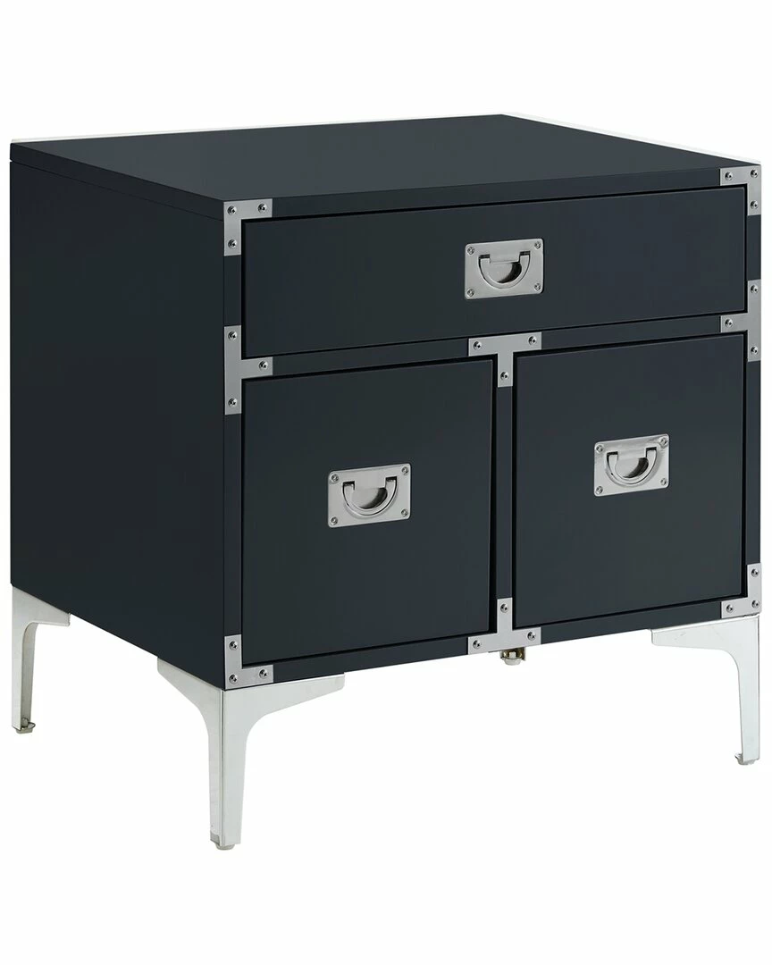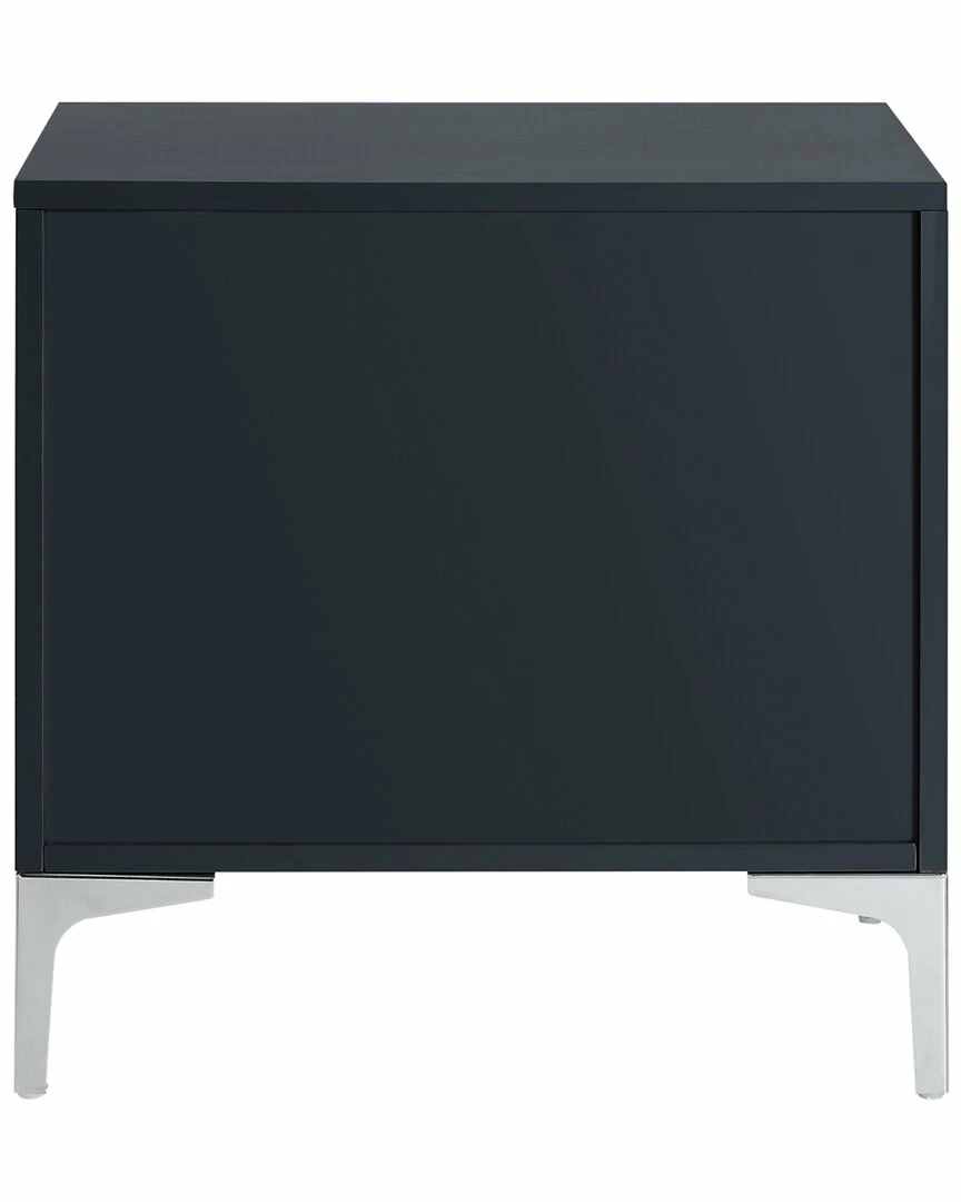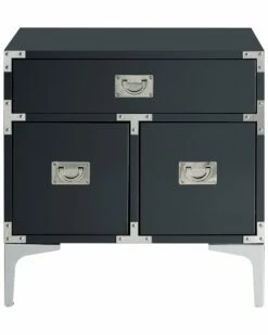 - Design details: MDF construction; lacquer finish with chrome leg, one drawer and two door compartments with decorative corner brackets and silver pull