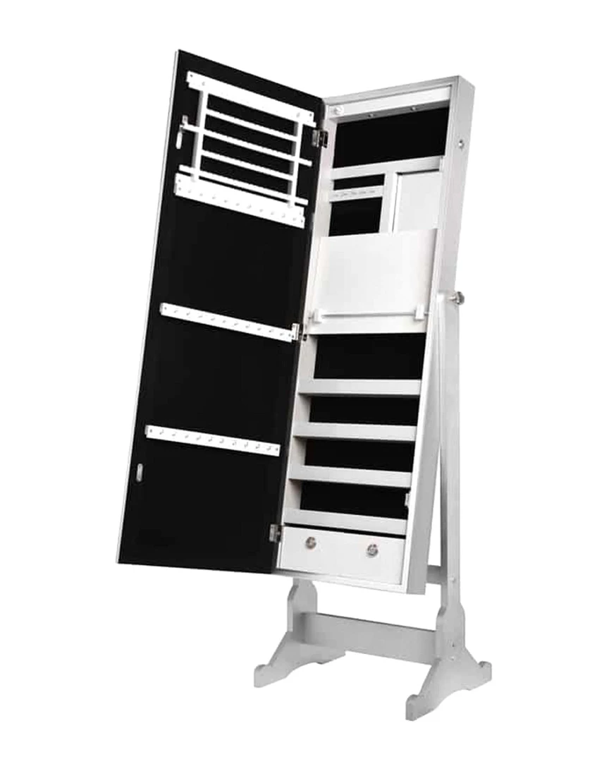 - Design details: Mirror construction; made of MDF wood; inner LED lighting; mirror border door contains a velvet interior; interior contains 35 metal necklace hooks, five bracelet hooks, three bars to hold 75 earrings, cushioned holes for up to 50 rings or stud earrings, pouch for documents, six compartments composed of four shelves, and two pull out drawers; easy to operate board and mirror; lock and key mechanism; multi position full length glass mirror; pullout drop down vanity table