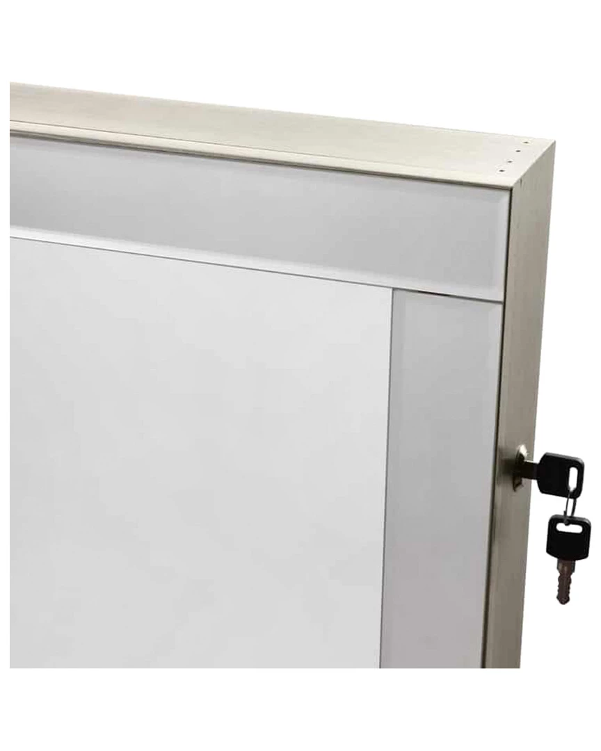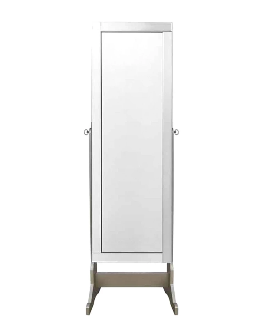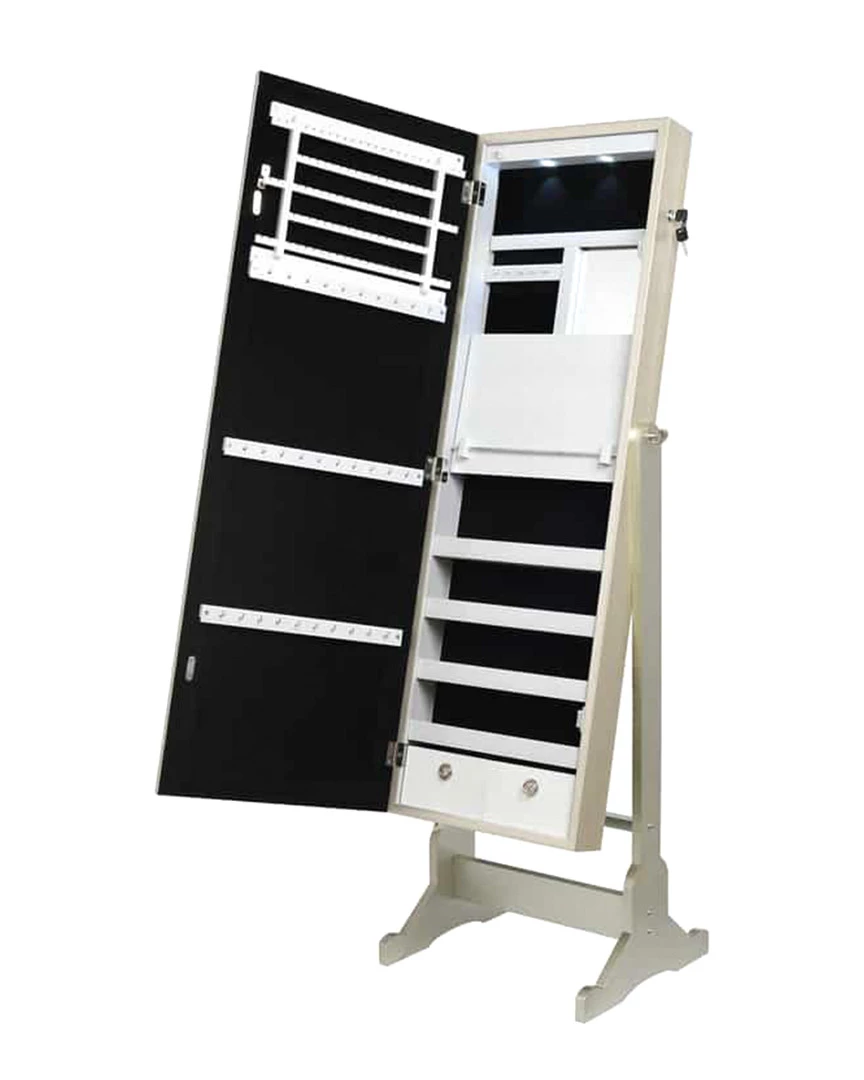 - Design details: Mirror construction; made of MDF wood; inner LED lighting; mirror border door contains a velvet interior; interior contains 35 metal necklace hooks, five bracelet hooks, three bars to hold 75 earrings, cushioned holes for up to 50 rings or stud earrings, pouch for documents, six compartments composed of four shelves, and two pull out drawers; easy to operate board and mirror; lock and key mechanism; multi position full length glass mirror; pullout drop down vanity table