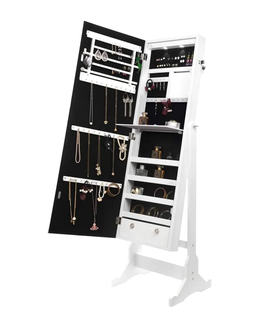 - Design details: Mirror construction; made of MDF wood; inner LED lighting; mirror border door contains a velvet interior; interior contains 35 metal necklace hooks, five bracelet hooks, three bars to hold 75 earrings, cushioned holes for up to 50 rings or stud earrings, pouch for documents, six compartments composed of four shelves, and two pull out drawers; easy to operate board and mirror; lock and key mechanism; multi position full length glass mirror; pullout drop down vanity table
