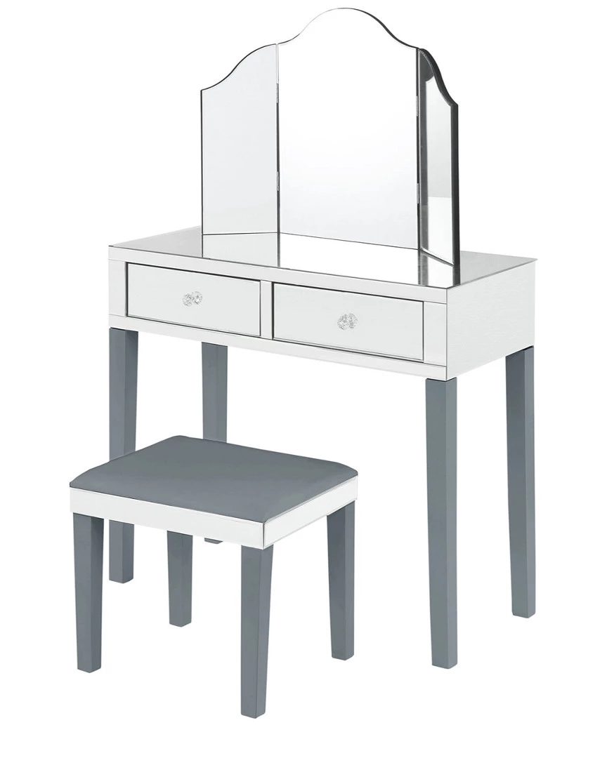 - Design details: MDF construction; features two storage drawers; smooth mirrored tabletop; matching stool with padded upholstered seat; tabletop vanity mirror with tri-fold design; mirrored top surface