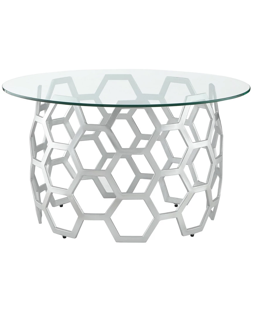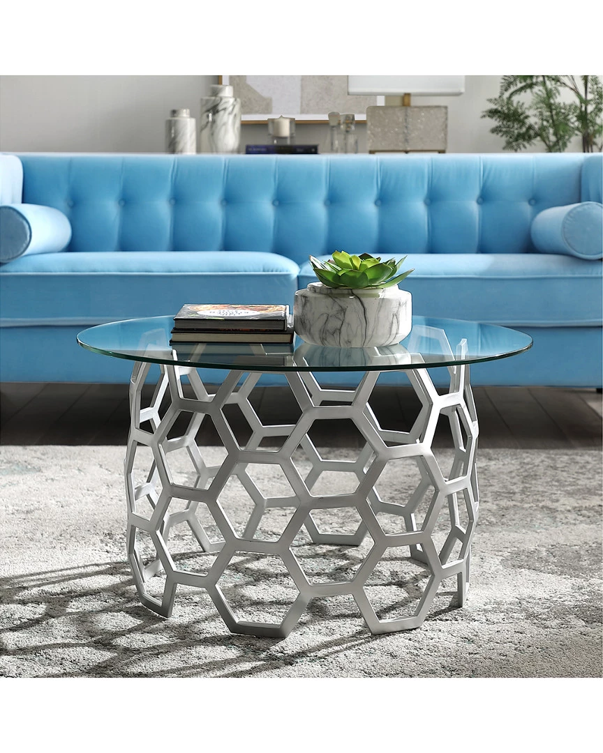 - Design details: This modern glass coffee table is designed with an elegant geometric hexagon metal frame and an open round top that creates a welcoming feeling and provides ample space to put drinks or decor on top. Whether using it as the perfect perch for your remote control or morning mug it brings a sophisticated and luxurious look to any setting. Perfect as an accent piece or centerpiece. Made with a safety-tempered glass top and a durable metal frame