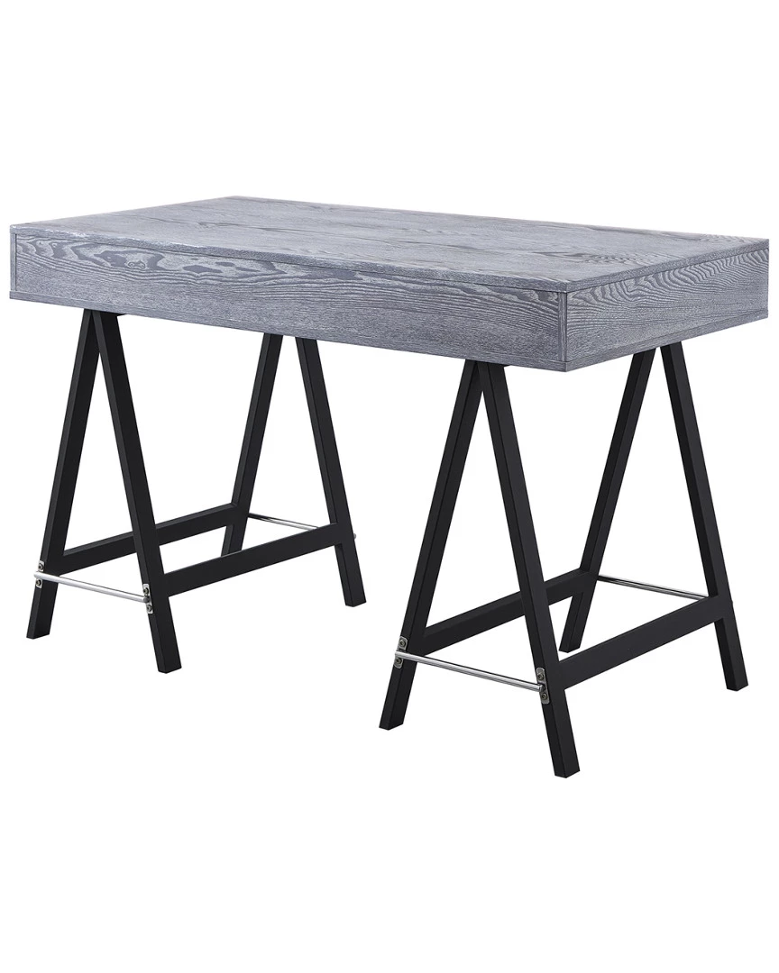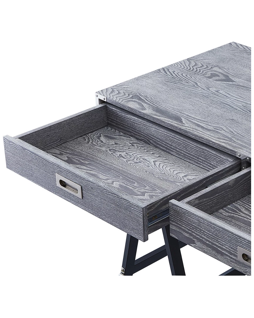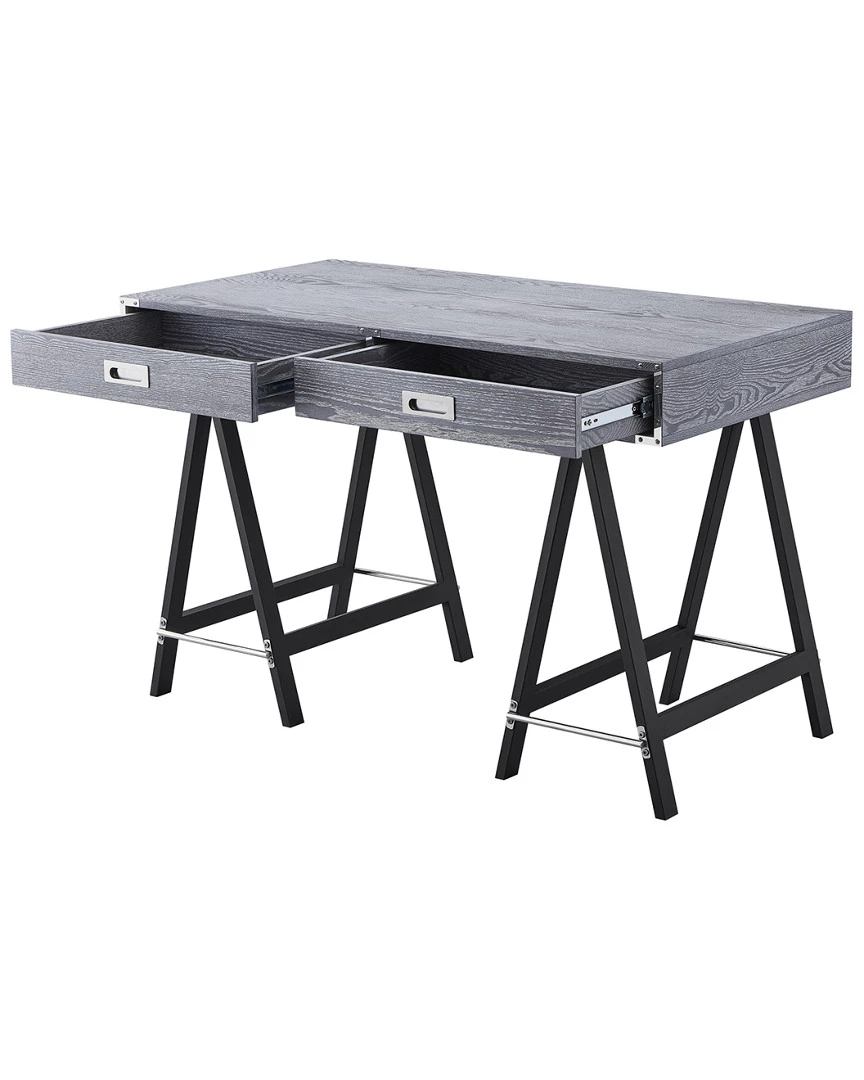 - The unusual design of this writing desk/vanity/makeup table/computer desk/console table make it a striking addition to any space, creating shimmering and lustrous appeal. Crafted from durable eco-friendly MDF with black powder coated A-shape leg design and corner brackets, matching pull out handles, this unique 2 drawer piece is an excellent solution for the modern home. Smooth gliding drawers are perfect for organizing small accessories.