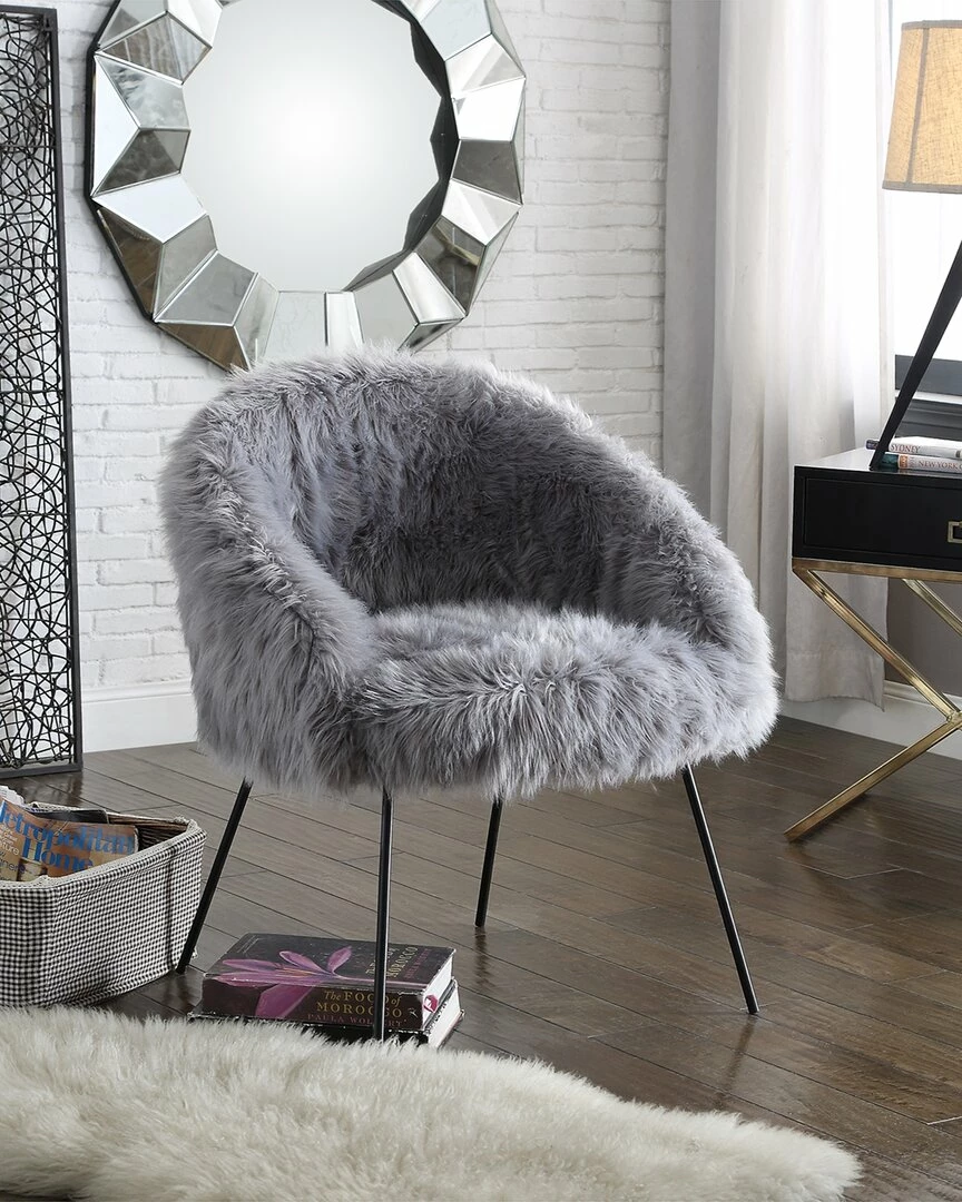 - Design details: Our faux fur accent chair adds a retro and groovy touch to your living room, bedroom or entryway. Featuring adorable shag fur, the comfort of a high density foam cushioned seat, this adorable pop of color accent piece can be mixed and matched, and provides not only dual functionality but also a focal point of style and flair that seamlessly incorporates your main decor to create an inviting and comfortable atmosphere to come home to. This accent chair is ideal for a kids to dorm rooms and everything in between.