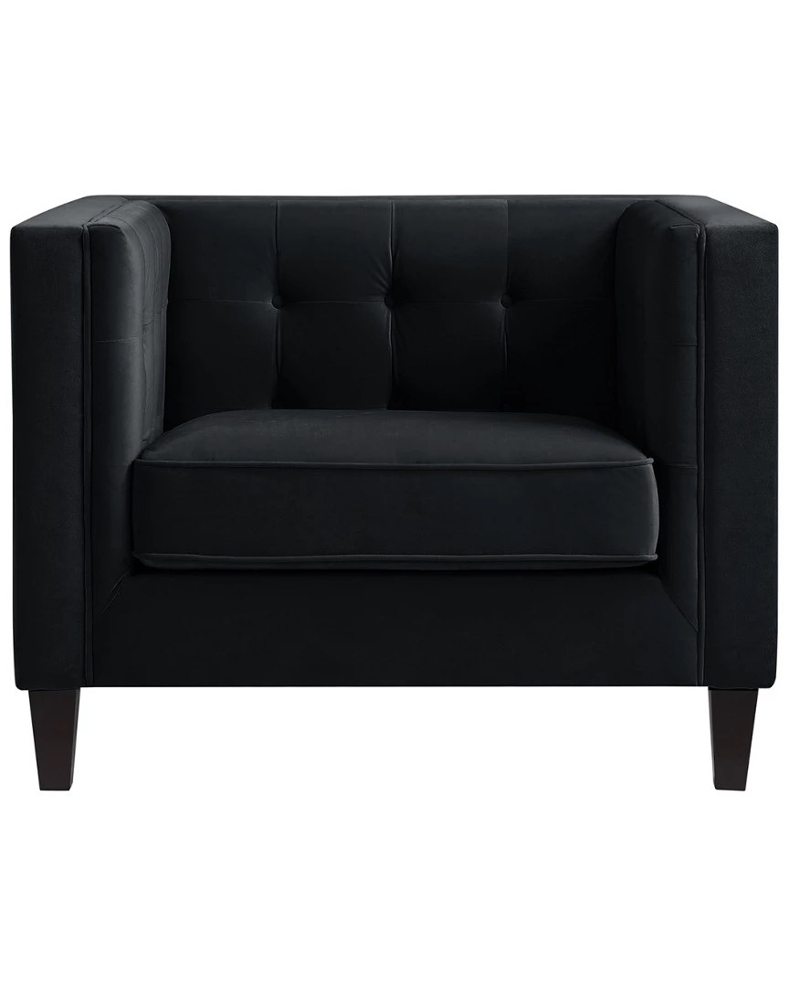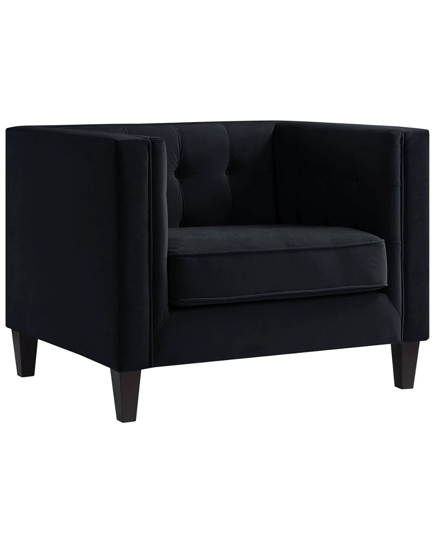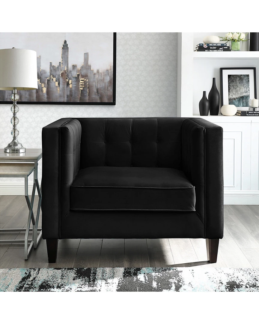 - Design details: Our velvet Tuxedo club chair adds a gentle sophistication in the confines of your living room, bedroom or entryway. This simple but elegant at the same time accent piece provides both functionality and a focal point of color and style that seamlessly blend with your main furniture to create a dynamic and cozy interior space to come home to. Straight lines, square arms, soft velvet handmade upholstery, biscuit button tufting and espresso finish tapered legs makes a brilliant combination for a perfect statement piece. Frame is made of combined solid wood and plywood, which makes construction to be firm and stable, and individually wrapped pocket springs give a nice support as you sit.