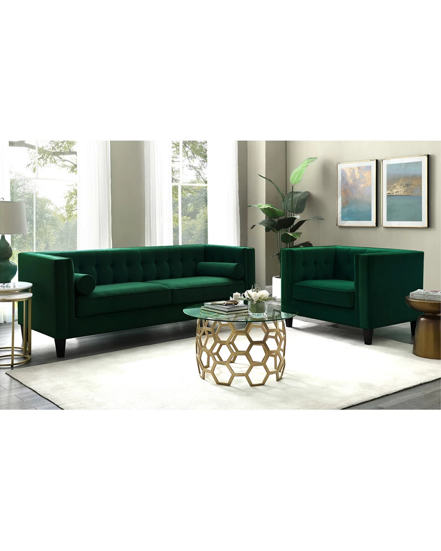 - Design details: Our velvet Tuxedo sofa adds a gentle sophistication in the confines of your living room, bedroom or entryway. This simple but elegant at the same time accent piece provides both functionality and a focal point of color and style that seamlessly blend with your main furniture to create a dynamic and cozy interior space to come home to. Straight lines, square arms, soft velvet handmade upholstery, biscuit button tufting and espresso finish tapered legs makes a brilliant combination for a perfect statement piece. Frame is made of combined solid wood and plywood, which makes construction to be firm and stable, and individually wrapped pocket springs give a nice support as you sit.