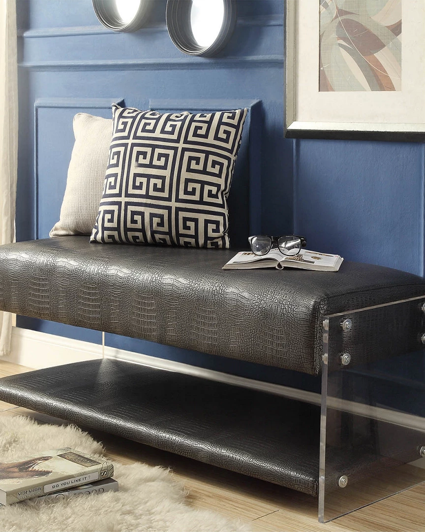 - Design details: Acrylic construction; PU leather; two tiers; high density foam cushioned seat; clear acrylic legs; high density foam; sturdy plywood frame