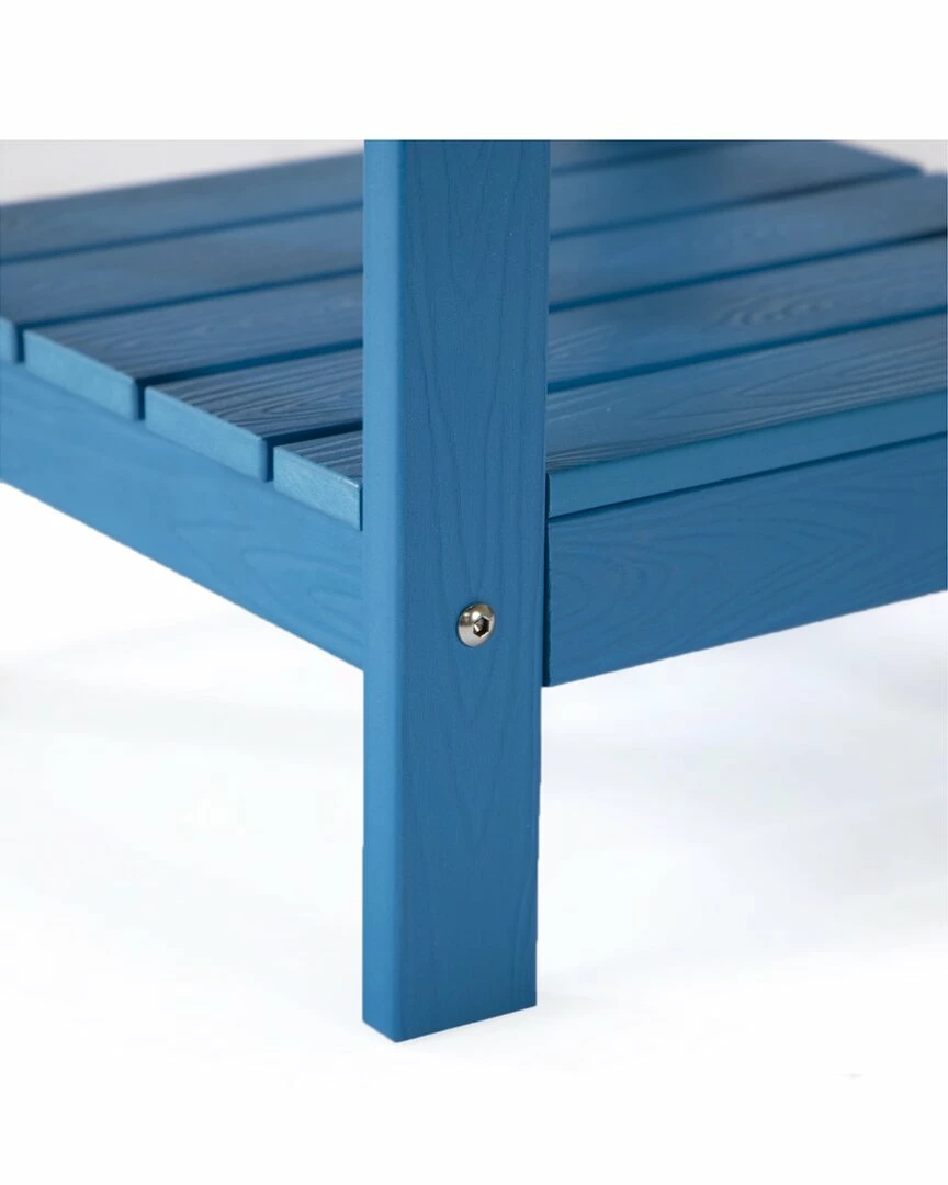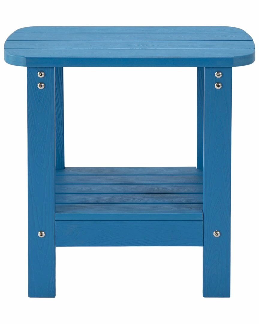 - With your own outdoor side table, you can make your life easier. This piece is noted for its appeal and durability. The multi-functional outdoor side table will look great on any front porch, backyard or deck. It combines natural beauty with a long-lasting structure. A piece of patio furniture that is built to be enjoyed! It is made of weatherproof faux wood (plastic) and stainless steel hardware.