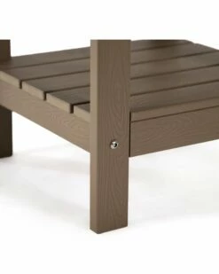 - With your own outdoor side table, you can make your life easier. This piece is noted for its appeal and durability. The multi-functional outdoor side table will look great on any front porch, backyard or deck. It combines natural beauty with a long-lasting structure. A piece of patio furniture that is built to be enjoyed! It is made of weatherproof faux wood (plastic) and stainless steel hardware.