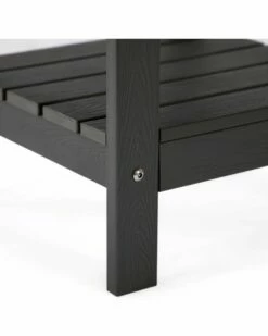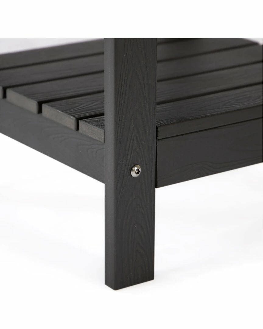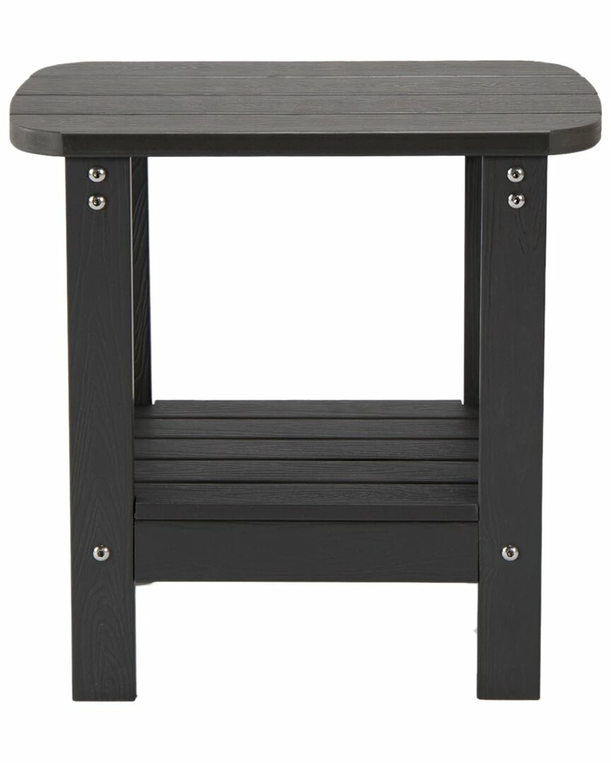 - With your own outdoor side table, you can make your life easier. This piece is noted for its appeal and durability. The multi-functional outdoor side table will look great on any front porch, backyard or deck. It combines natural beauty with a long-lasting structure. A piece of patio furniture that is built to be enjoyed! It is made of weatherproof faux wood (plastic) and stainless steel hardware.