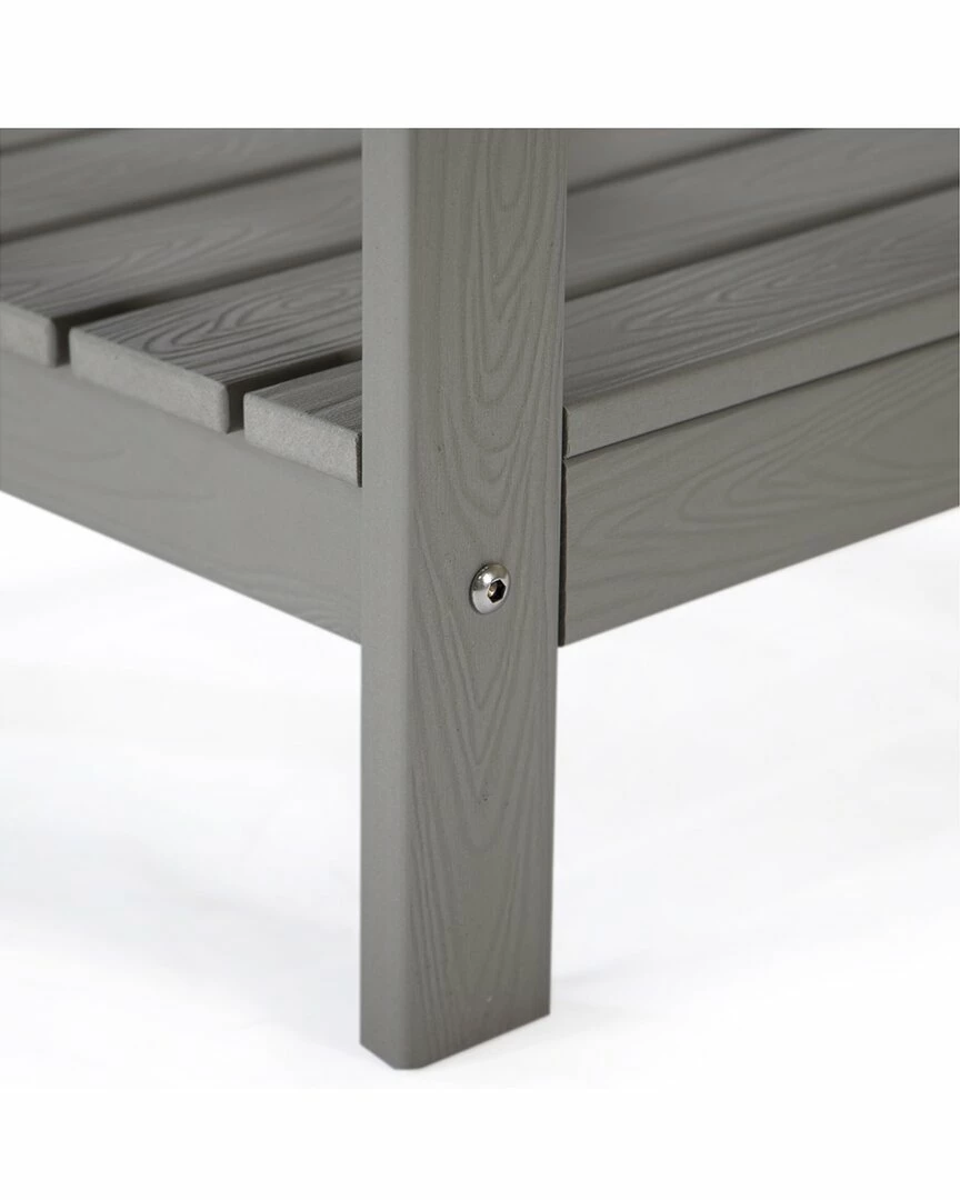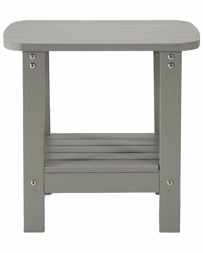 - With your own outdoor side table, you can make your life easier. This piece is noted for its appeal and durability. The multi-functional outdoor side table will look great on any front porch, backyard or deck. It combines natural beauty with a long-lasting structure. A piece of patio furniture that is built to be enjoyed! It is made of weatherproof faux wood (plastic) and stainless steel hardware.