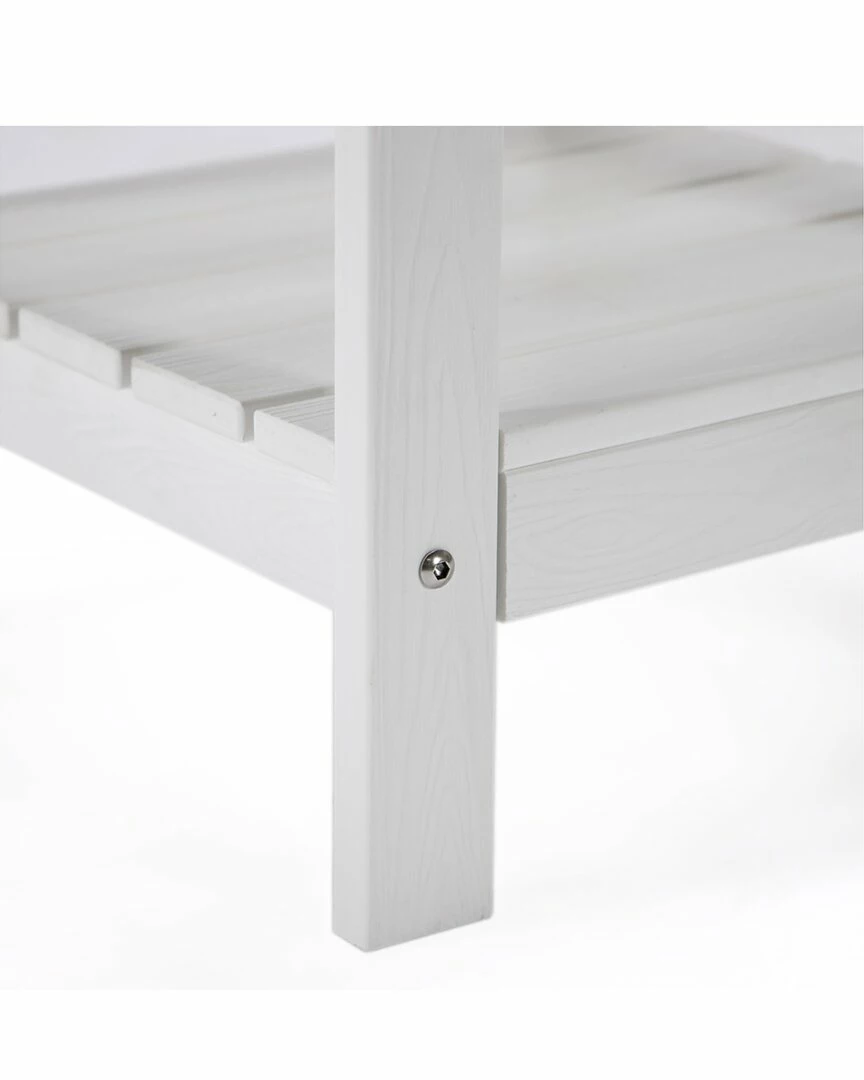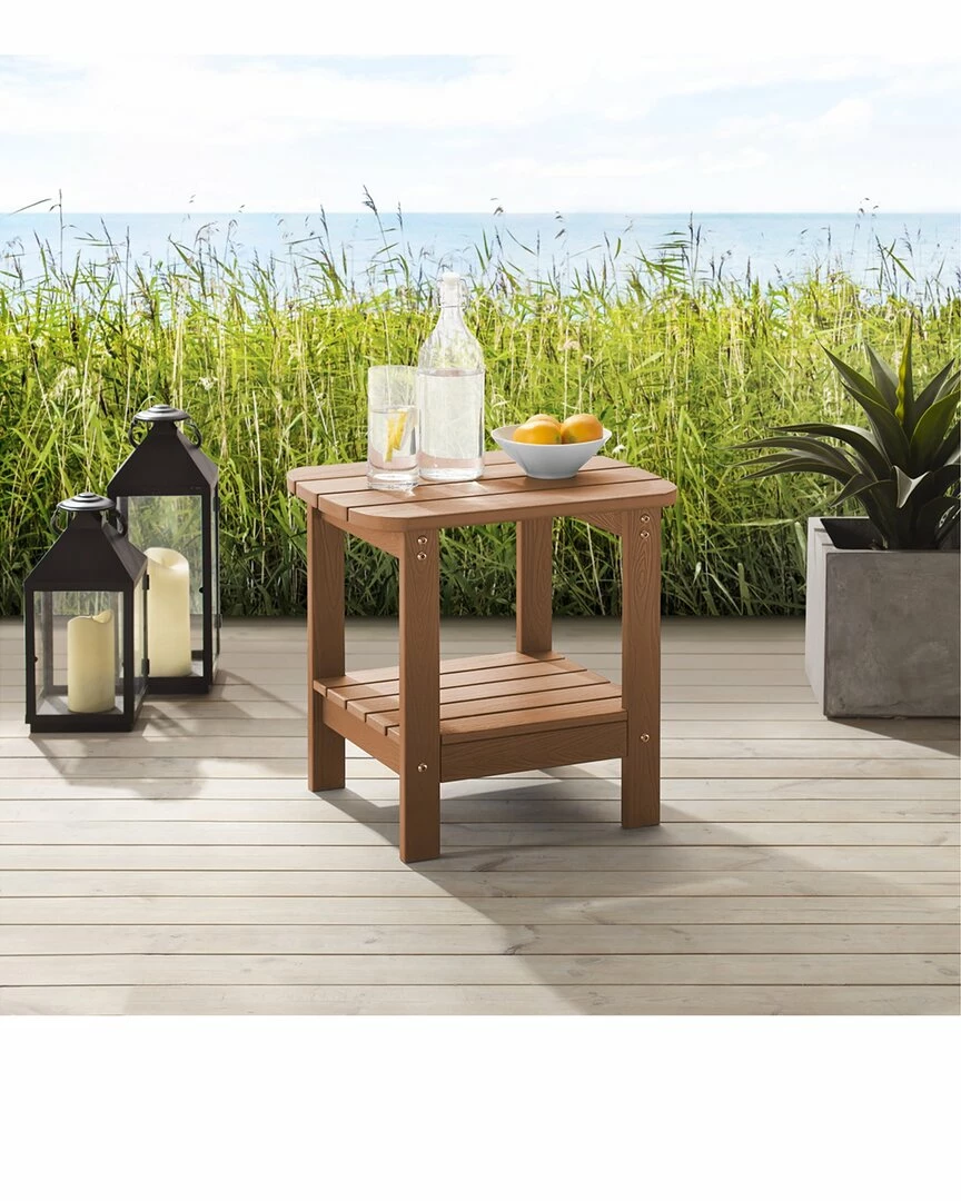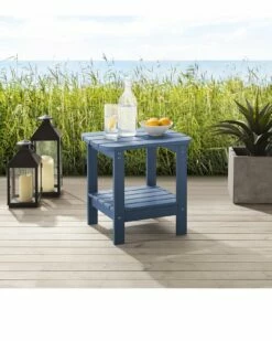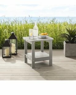 - With your own outdoor side table, you can make your life easier. This piece is noted for its appeal and durability. The multi-functional outdoor side table will look great on any front porch, backyard or deck. It combines natural beauty with a long-lasting structure. A piece of patio furniture that is built to be enjoyed! It is made of weatherproof faux wood (plastic) and stainless steel hardware.